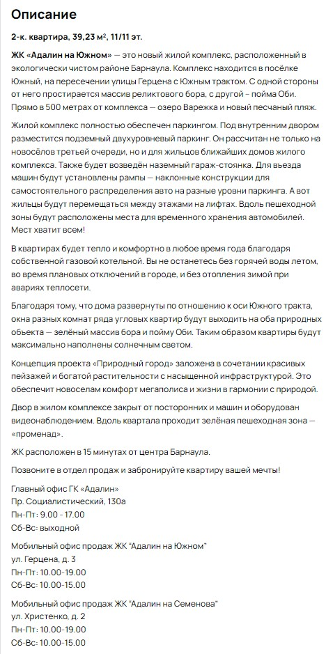 Ты — специалист по недвижимости. Напиши описание квартиры в новостройке строительной компании Адалин для размещения в Авито.