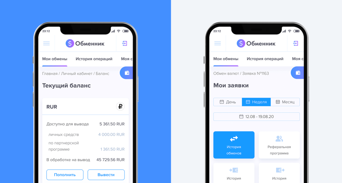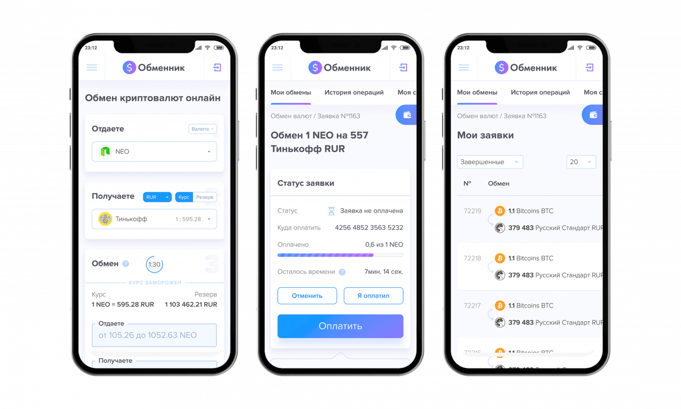 Мы разработали удобный и безопасный сервис с приятным дизайном и уникальным логотипом. Теперь не нужно мониторить сразу несколько сайтов и забивать память телефона приложениями под каждую отдельную валюту. В одном месте собраны необходимые инструменты для отслеживания курса, безопасного и выгодного обмена, вывода валюты на любой доступный счет.