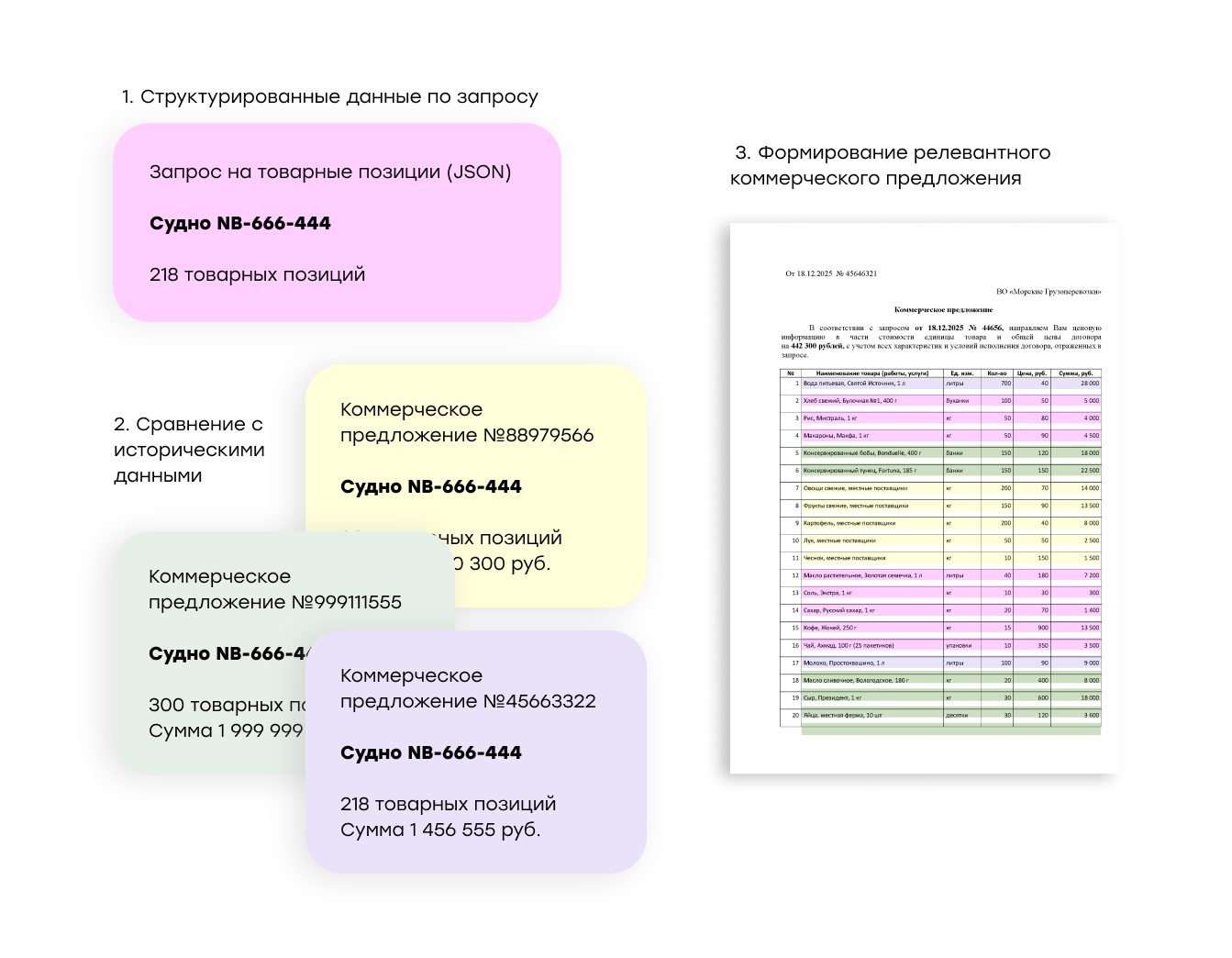 Всё это требовало ручной работы: закупщики вручную вносили позиции в ERP, сверяли их с историей закупок этих же судов, искали подходящих поставщиков, формировали коммерческие предложения и согласовывали их для каждого судна.