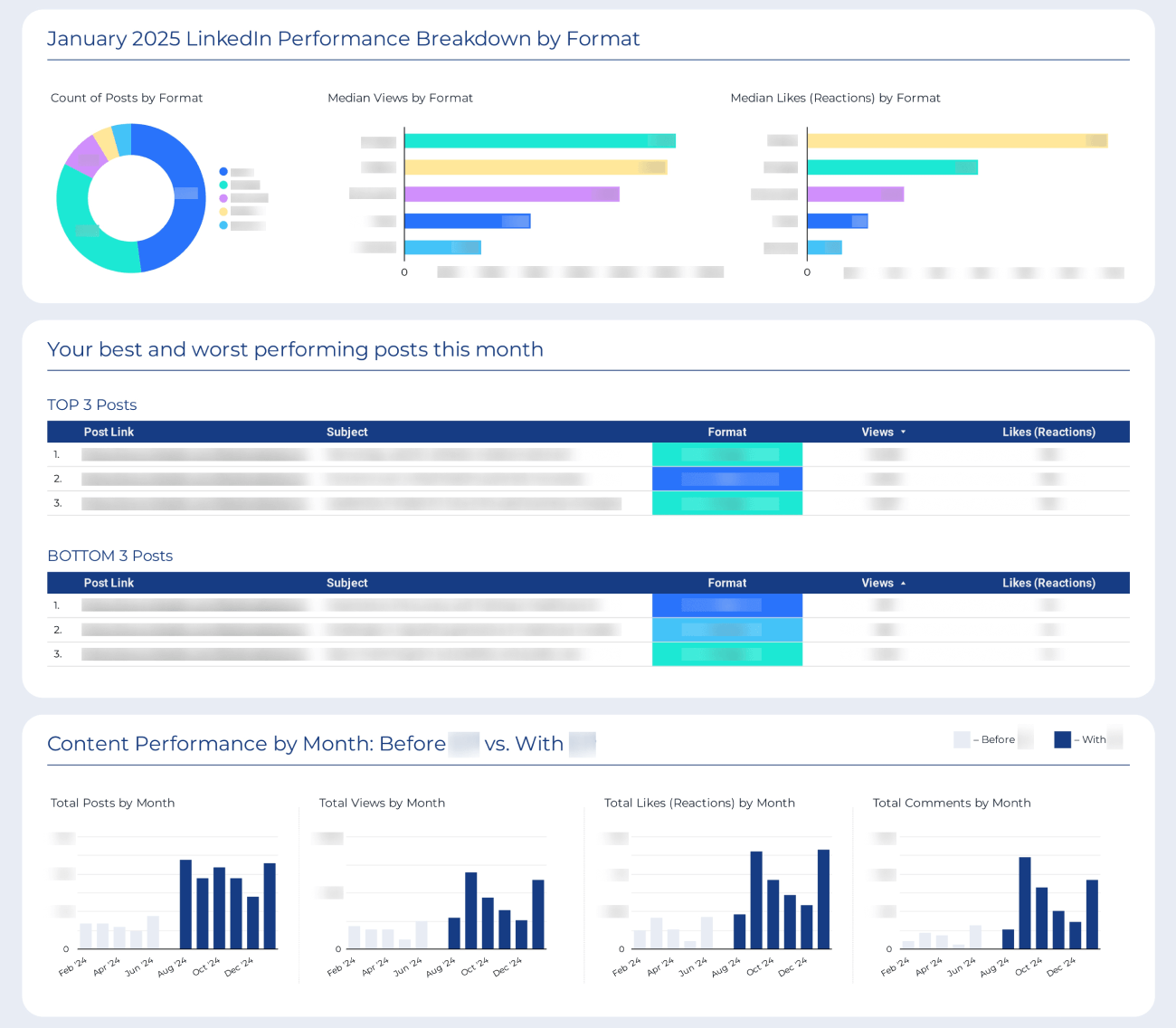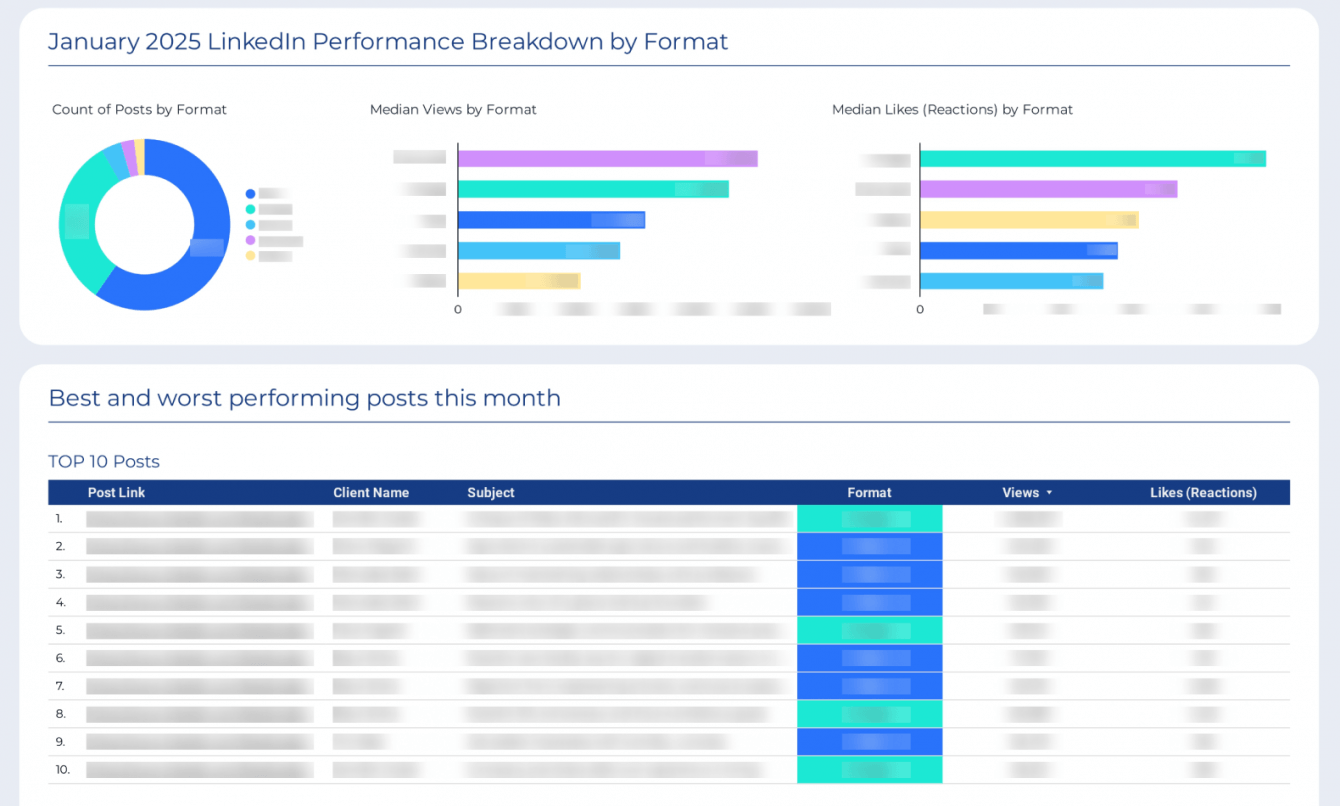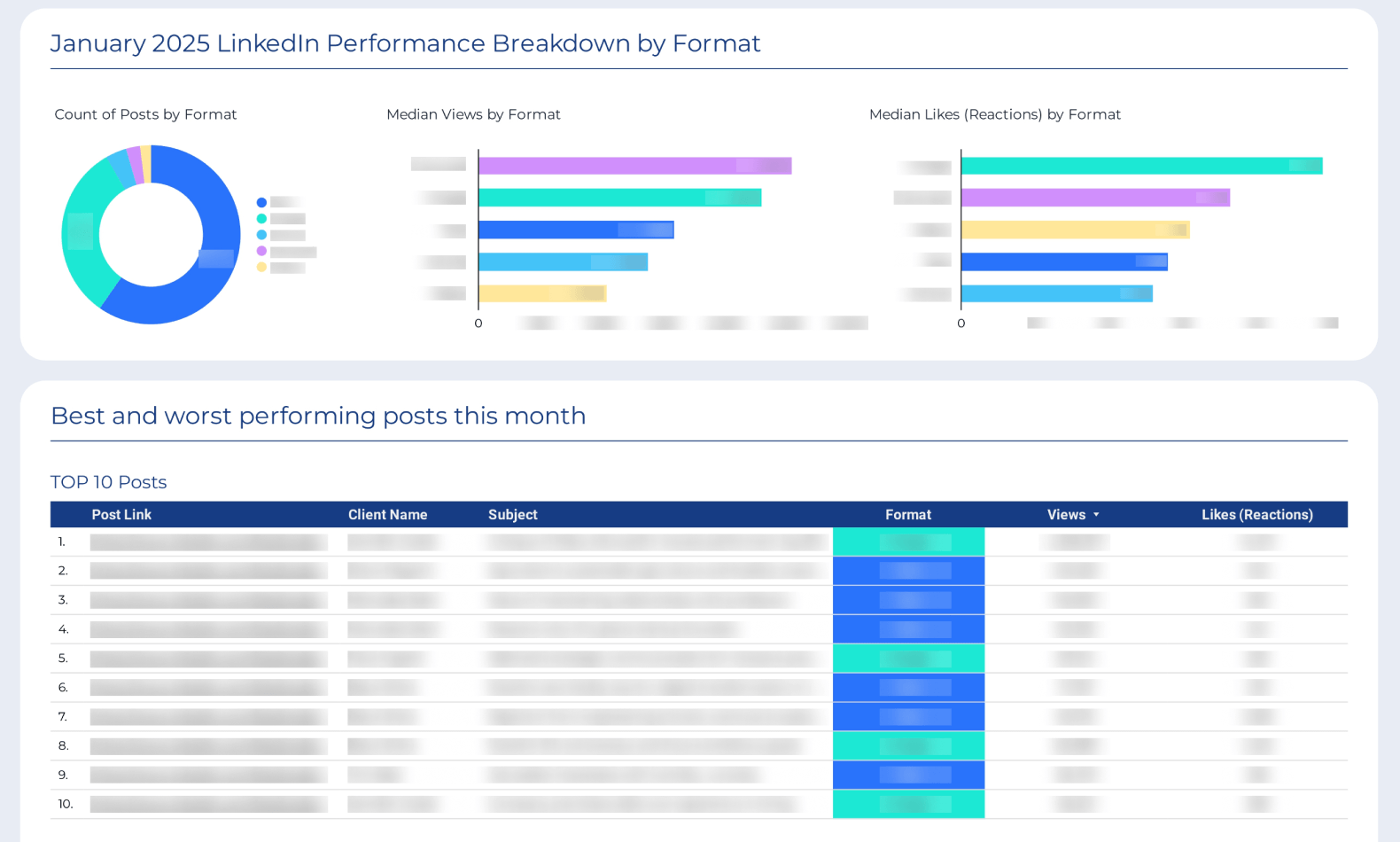 Наш клиент — компания, управляющая контентом для заказчиков в LinkedIn. Они создают посты для 80 клиентов и предоставляют детализированные отчеты об их эффективности.