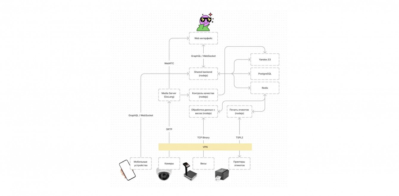 На складе есть сервер, где развернут 1С и роутеры Mikrotik один из которых подключен с помощью Wireguard по зашифрованному каналу к серверами в Яндекс Облаке. Таким образом мы можем связать базу данных, весы, камеры, принтеры и приложения в одну сеть, где данные обрабатываются быстро и безопасно. Посмотрим на компоненты ближе.