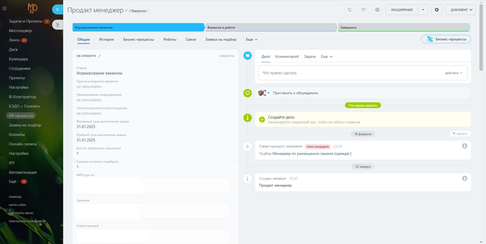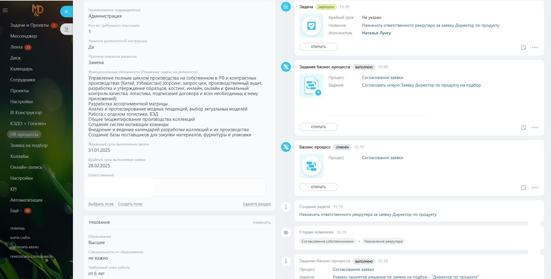 Компания столкнулась с необходимостью полной цифровизации HR-процессов. Отдел персонала ежедневно обрабатывал десятки заявок на подбор, работал с вакансиями разного уровня сложности — от массового найма до поиска топ-менеджеров. Процессы велись вручную, что замедляло согласования, увеличивало риск ошибок и снижало контроль на всех этапах.