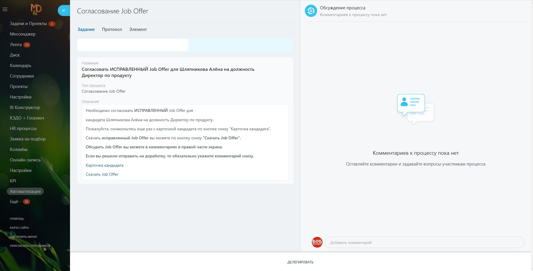 Были созданы воронки согласования заявок на подбор и самого процесса подбора. Теперь Job Offer формируется автоматически в единой форме.