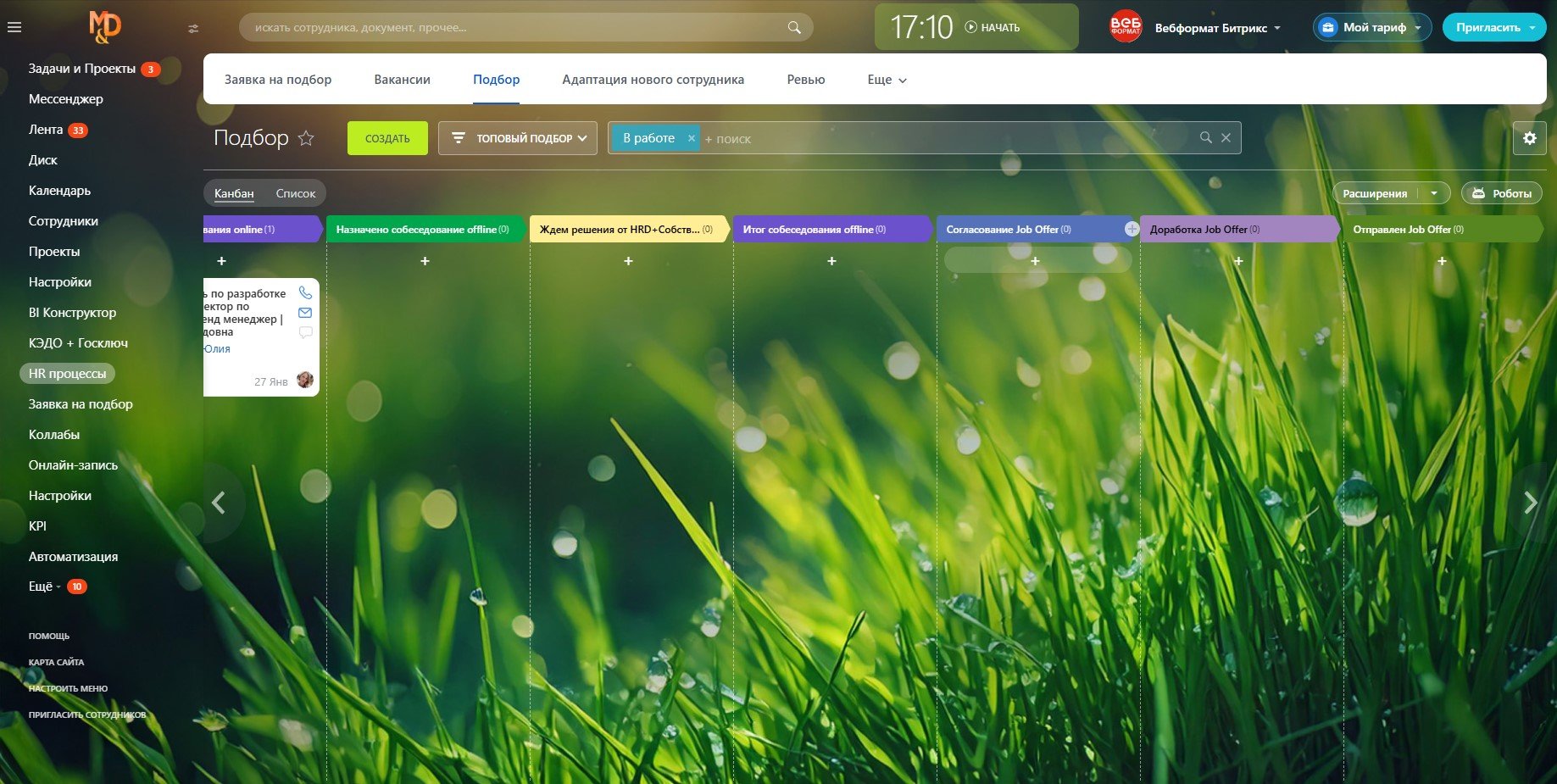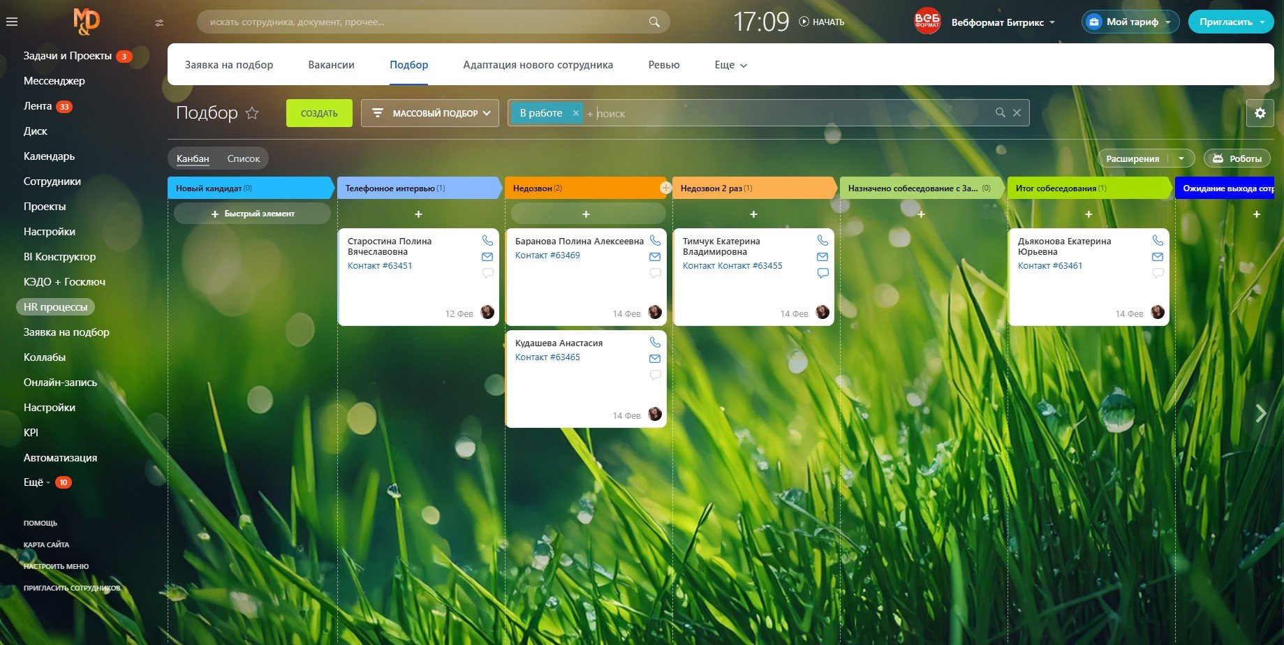Автоматизация HR-процессов в Битрикс24 позволила отделу кадров значительно повысить эффективность работы рекрутинга, сократить сроки согласования заявок и повысить контроль за всеми этапами подбора персонала.