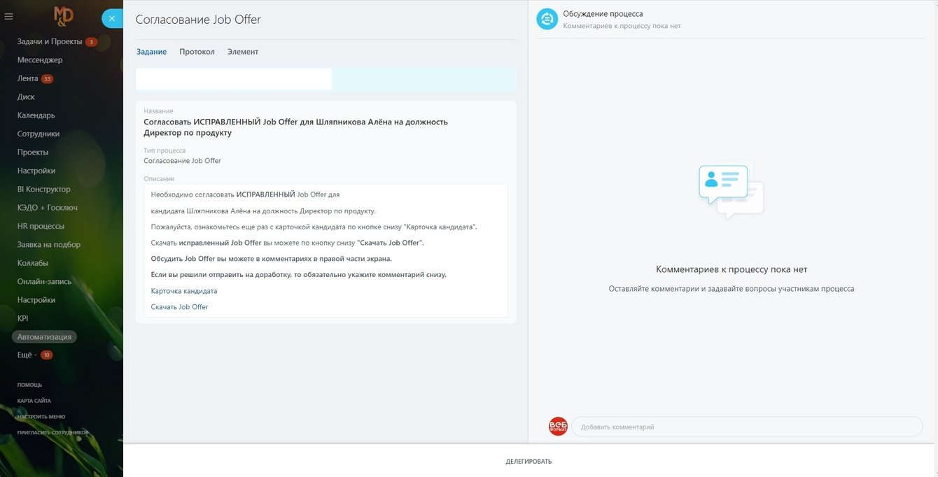 - После успешного согласования система автоматически формирует и отправляет кандидату ранее согласованный Job Offer между генеральным директором и HR-директором.