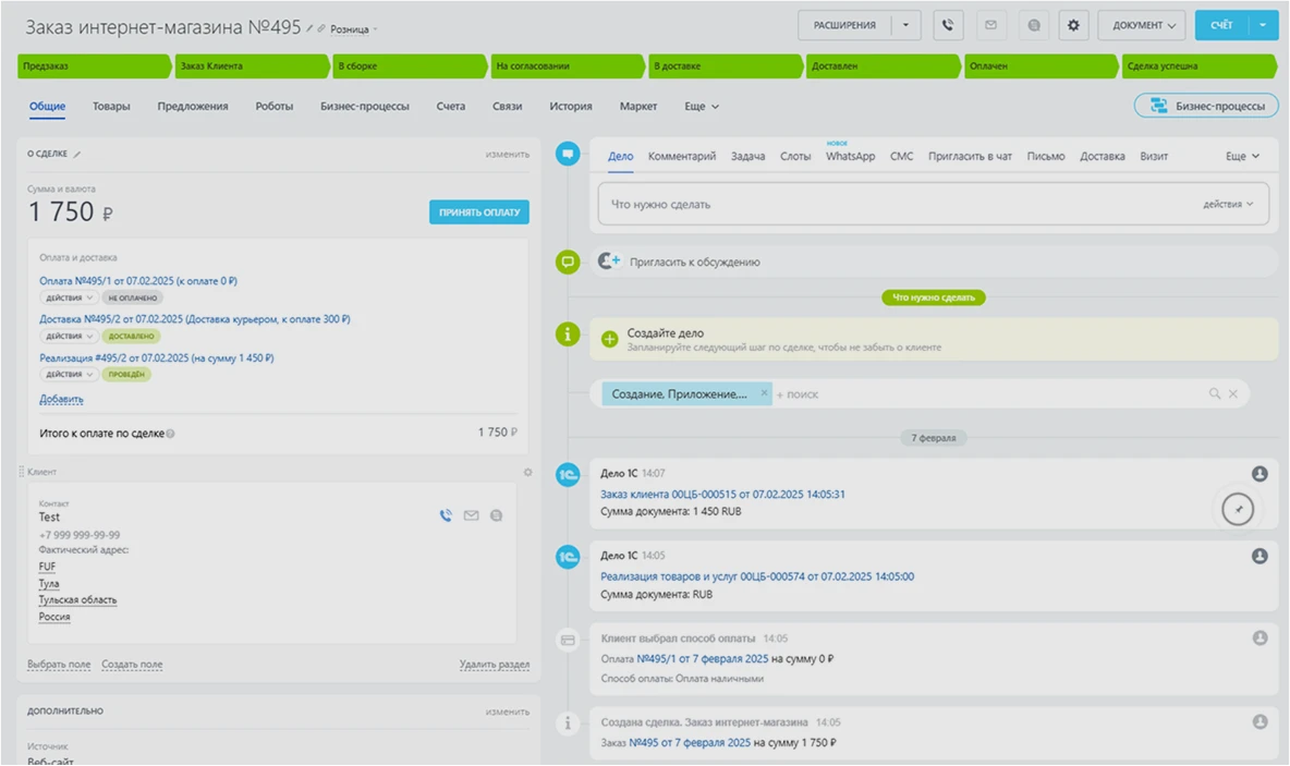 • Автоматические карточки клиентов. При первом заказе система сама создаёт контакт, чтобы менеджер мог моментально уточнить детали.