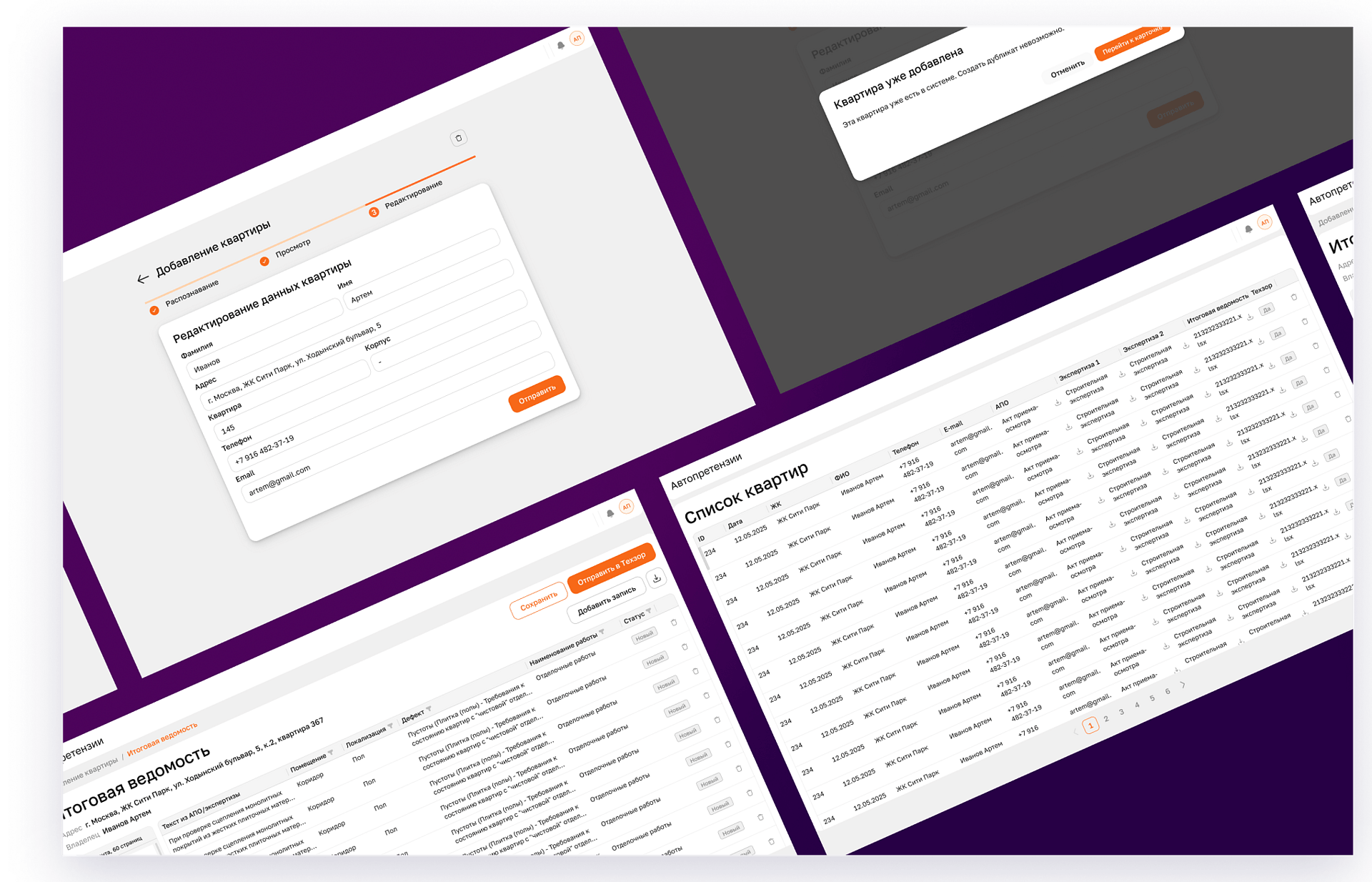 Сделали работу «сквозной»: пользователь заходит в веб-интерфейс, загружает документы, а система сразу распознаёт данные из АПО и экспертиз. Всё, что нужно поправить или уточнить, редактируется на месте — можно добавлять и удалять дефекты, виды работ, помещения и локализации