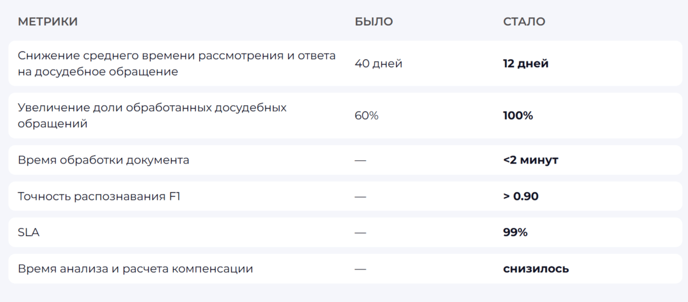 Благодаря сквозной автоматизации время обработки снижается, ручная нагрузка уходит, данные становятся единообразными и пригодными для аналитики, а поток досудебных обращений закрывается полностью.