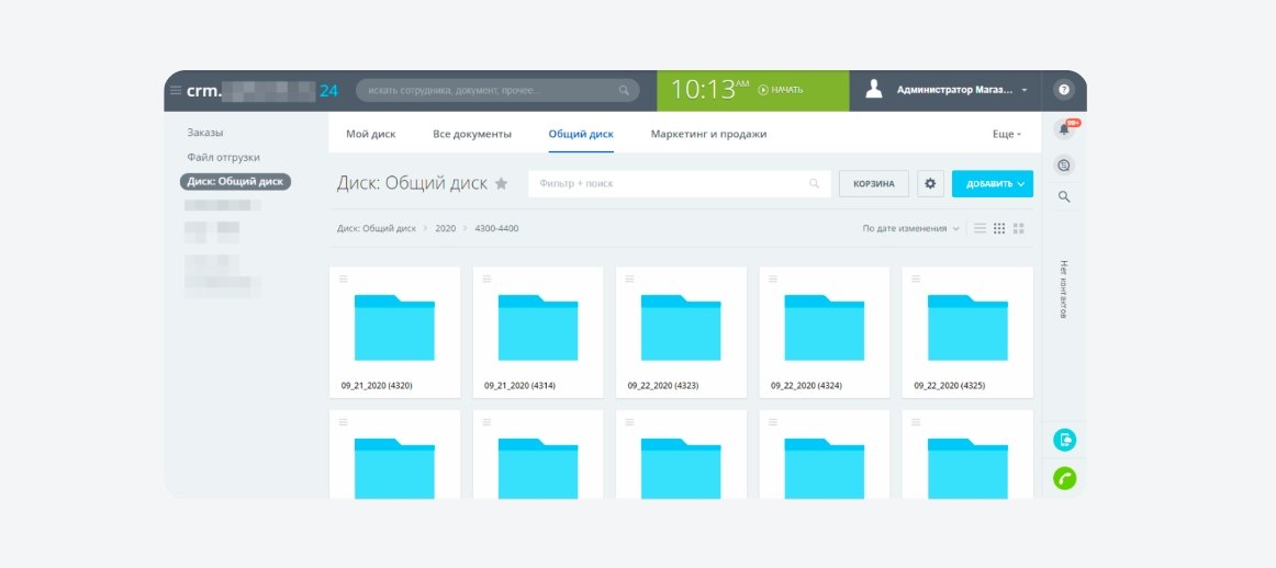 Для удобства работы менеджера и руководителя настроили сохранение документов по заказам на диск Битрикса в определенной иерархии папок (по годам, по диапазонам номеров заказов, по номерам заказов).