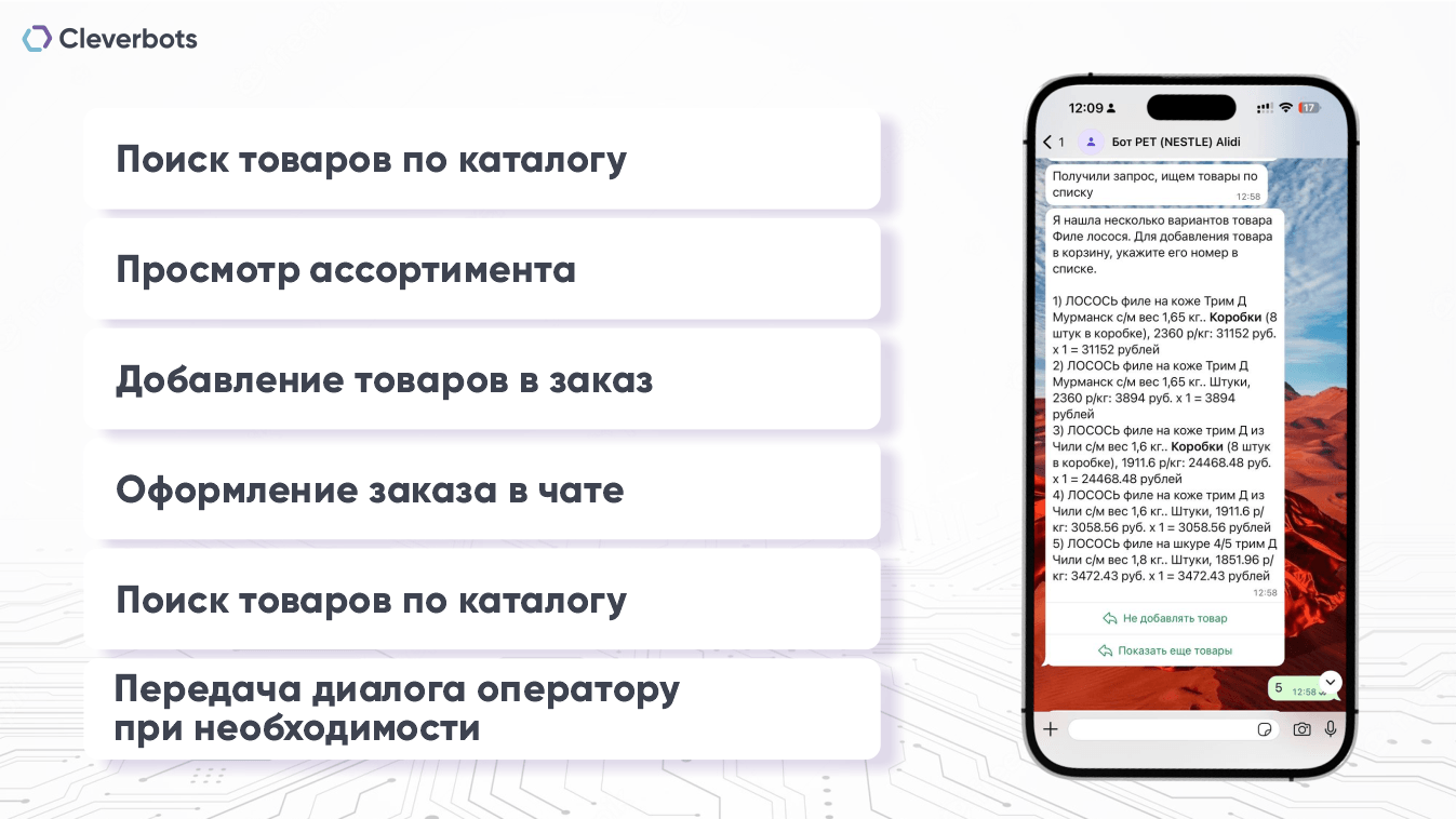 Задача Cleverbots - дать клиентам возможность самостоятельно оформлять заказы в привычном канале. При этом сократить ручные операции менеджеров и сохранить возможность подключения оператора.