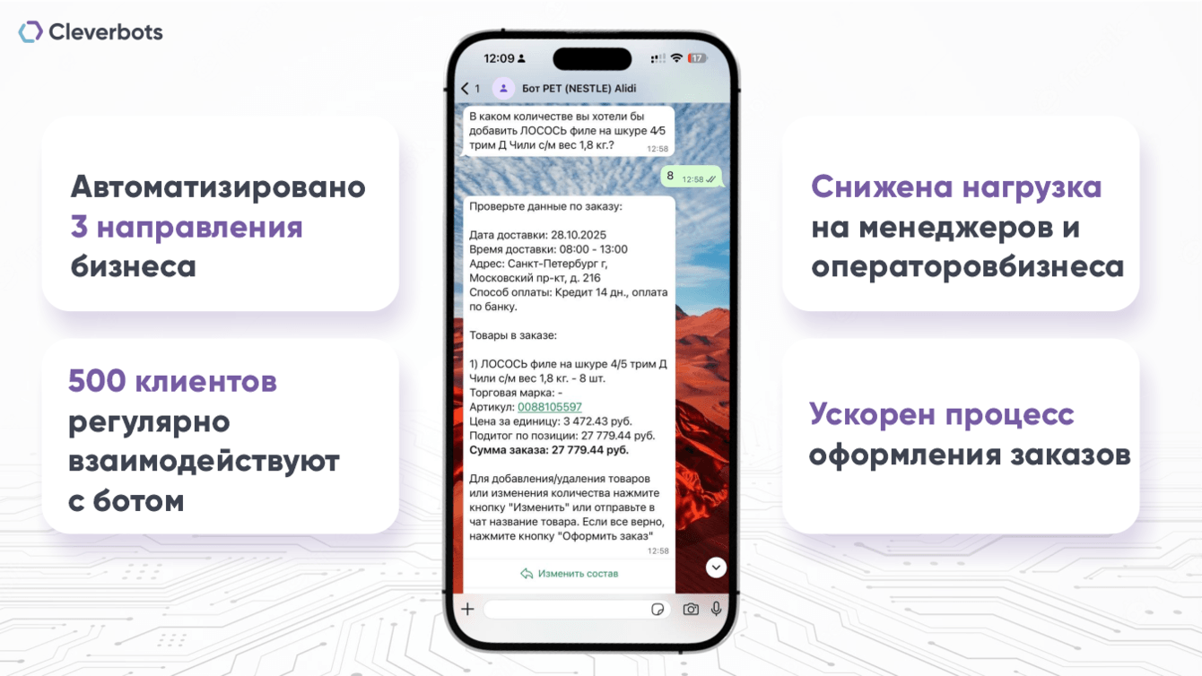 После внедрения чат-бота компания получила дополнительный канал для оформления заказов и снизила нагрузку на менеджеров по продажам.