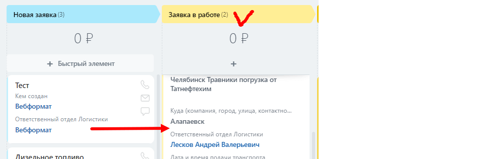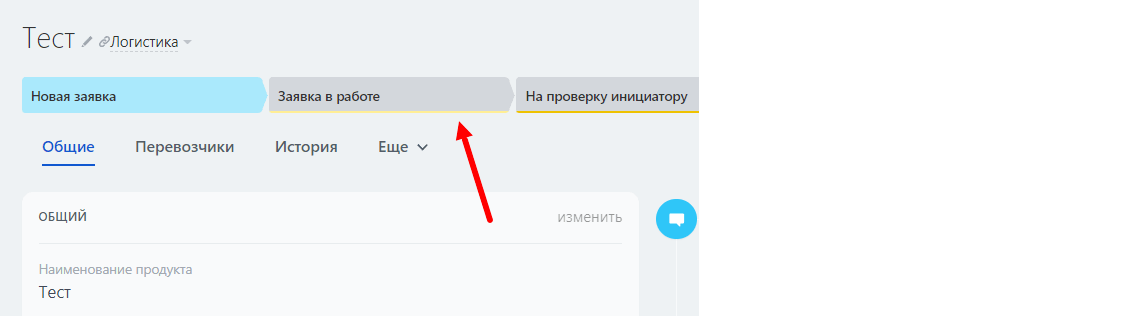 Далее, любой сотрудник отдела логистики может взять заявку в работу, для этого необходимо перетащить карточку на стадию “Заявка в работе” либо открыть карточку и сверху выбрать стадию “Заявка в работе”.