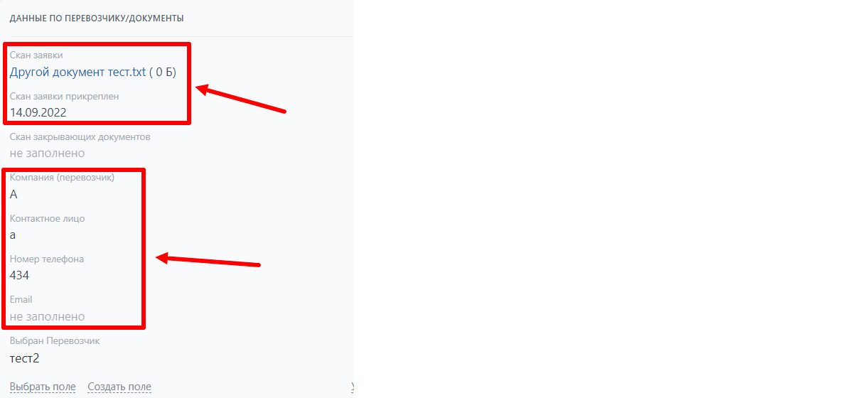 Нужные поля в карточке заявки раздела “ДАННЫЕ ПО ПЕРЕВОЗЧИКУ/ДОКУМЕНТЫ” заполняются автоматически, также карточка автоматически переносится в стадию "Сбор закрывающих документов"