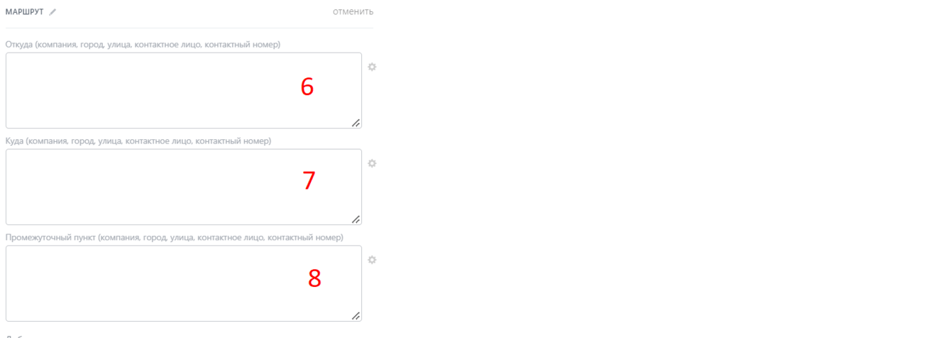 Раздел МАРШРУТ 6 - Заполняем данные откуда забрать (компания, город, улица, контактное лицо, контактный номер) 7 - Заполняем данные куда доставить (конечный пункт) 8 - Промежуточный пункт заполняем если есть, их может быть несколько