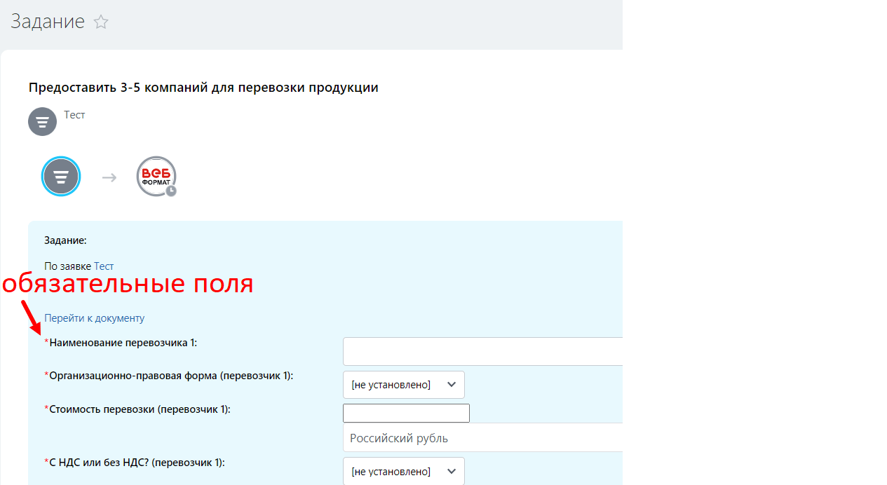 Далее создается задание на ответственного отдела Логистики “Заполните информацию по перевозчику “....” и прикрепить скан заявки “....””. Необходимо заполнить все обязательные поля и сохранить задание.