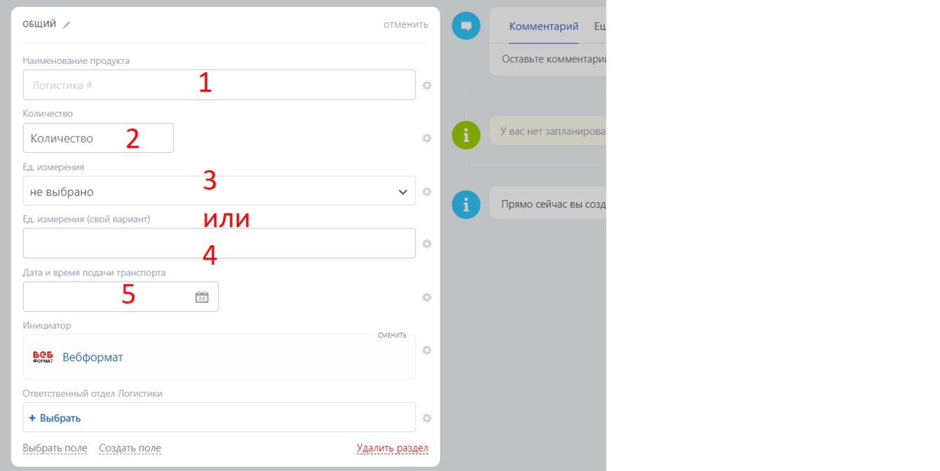 Раздел ОБЩИЙ: 1 - “Наименование продукта” 2 - “Количество” 3 - Выбираем единицу измерения из предложенных вариантов 4 - Указываем свой вариант, если в поле 3 нет нужного значения 5 - Дата и время подачи транспорта.