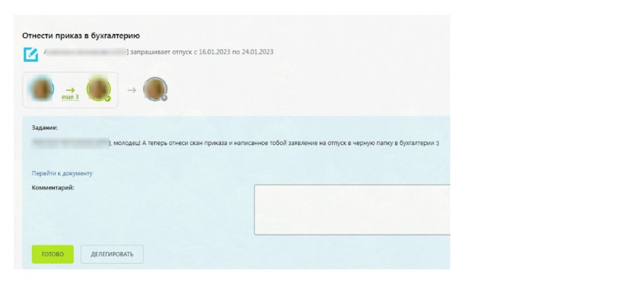 Если отпуск отклоняется, то руководитель указывает причину и бизнес-процесс с заданием возвращается сотруднику с комментарием. Например, были неверно указаны даты.