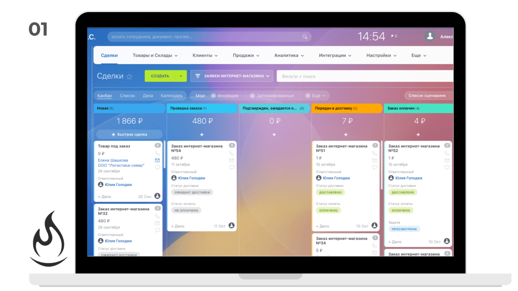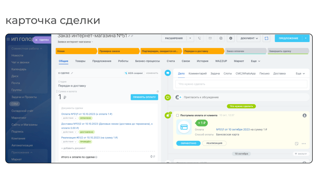 Автоматизация оплаты от клиента на сайте и в CRM: оплачивает заказ картой, заказывает доставку и после подтверждения менеджером заказ отправляется в систему. Эквайринг настроен, и менеджеру стало легче отследить заказ, так же все процессы интегрированы с CRM по готовому решению Битрикс24: Интернет-магазин + CRM.