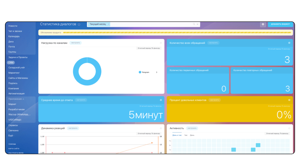 Подключили функцию статистики диалогов, которая помогает менеджерам или руководителю отследить среднее время ответа клиенту, количество всех обращений как первичных, так и повторных. И общую активность коммуникации менеджеров с клиентами.