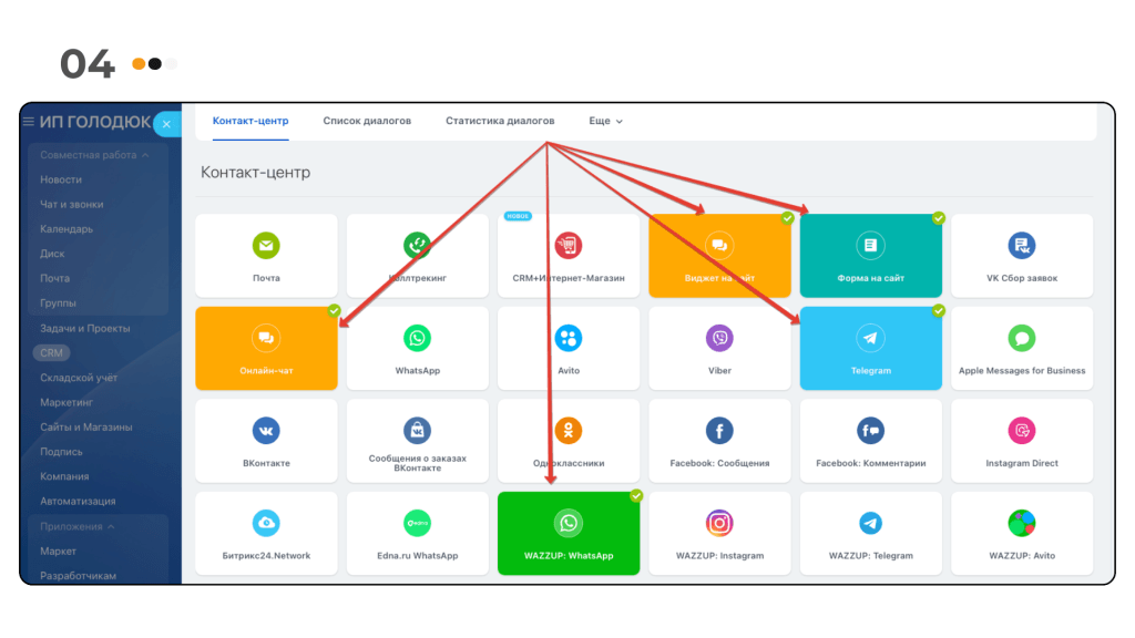Добавили каналы связи между сайтом и CRM. Далее подключили дополнительные источники Telegram, WhatsApp для коммуникации с клиентами из "офлайн" встреч.
