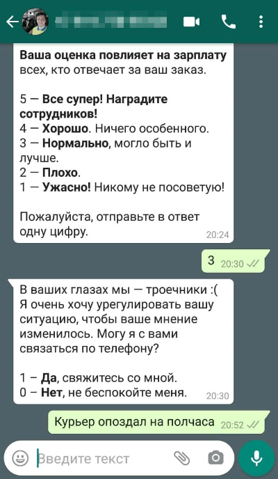 Если клиент отправил цифру от 1 до 5, то оценка передается в соответствующее поле в карточке заказа retailCRM «Оценка покупателя». Это поле заполняется скриптом и недоступно для редактирования менеджерами.