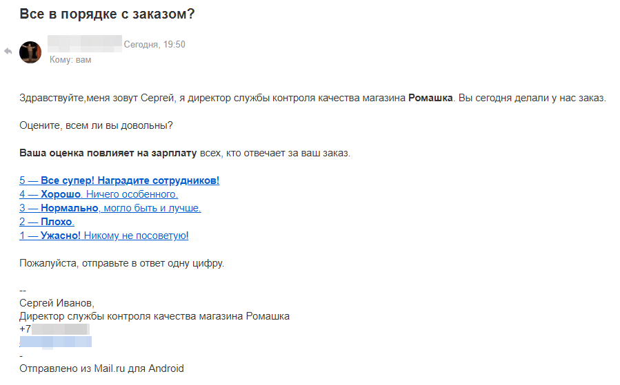 Большинство интернет-магазинов, собирающих такой фидбек, ограничиваются отправкой шаблонного электронного письма или SMS с просьбой оценить заказ. Зачастую формулировка таких обращений весьма бюрократичная, неприветливая и слабо побуждает покупателя отреагировать на сообщение.