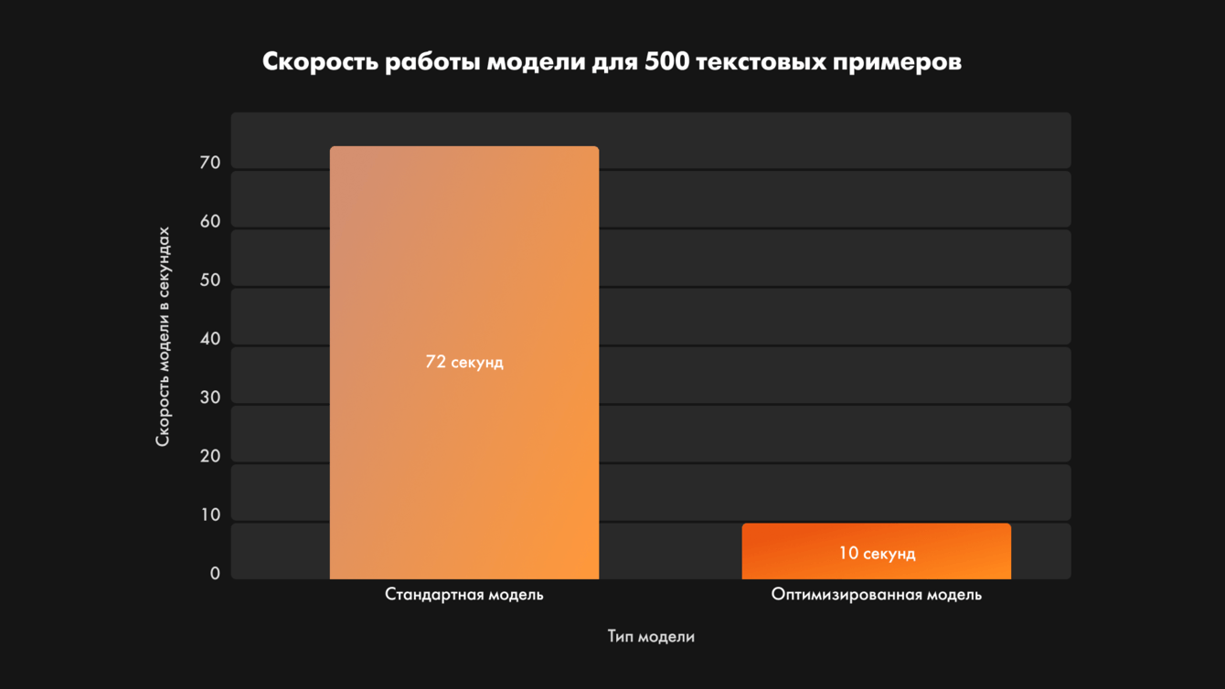 Современные нейросетевые модели хотя и являются мощными решениями задач естественной обработки языка, но они очень медлительны и объемны при работе на пользовательских ЦП. Наши аналитики нашли способ ускорения этого процесса, снизив время обработки 500 фраз в 256 символов до 1 секунды, включая весь процесс обработки.