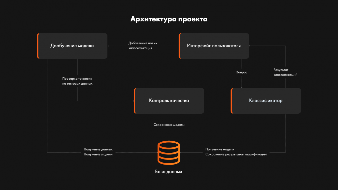 Кроме того, в модель заложен модуль переобучения математической модели. Если у клиента изменились данные (появились новые текстовые примеры, новые классы и т.д.), он может инициировать процесс переобучения модели. Если новая модель удовлетворяет метрикам качества, то она заменяет текущую модель сервиса.