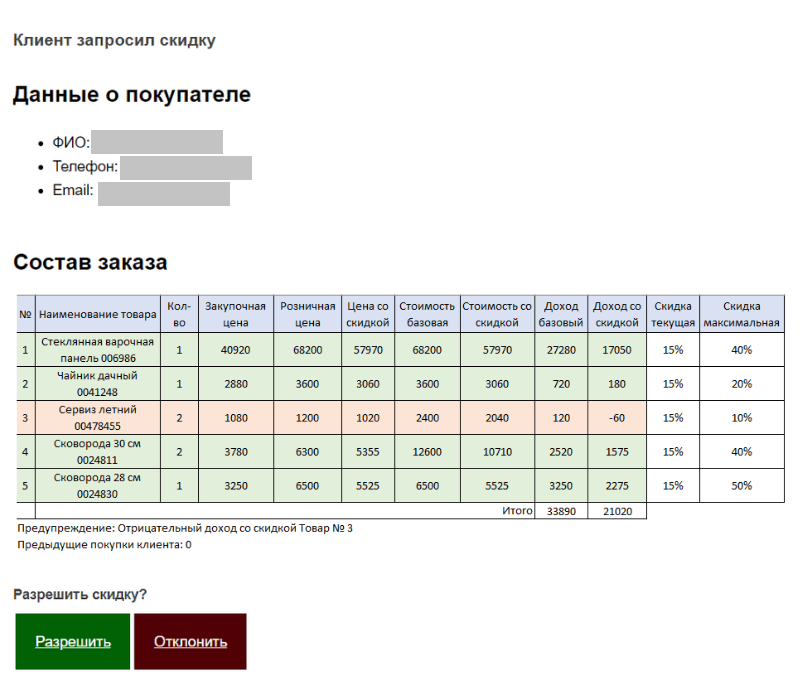 Если клиент просит скидку, менеджер переводит заказ в статус «Запрос скидки». Финансовому директору и его заместителю автоматически приходит письмо о согласовании скидки со всеми данными о клиенте и заказе, в том числе содержащую информацию о рентабельности каждого отдельно взятого товара и максимальной скидке «в ноль».