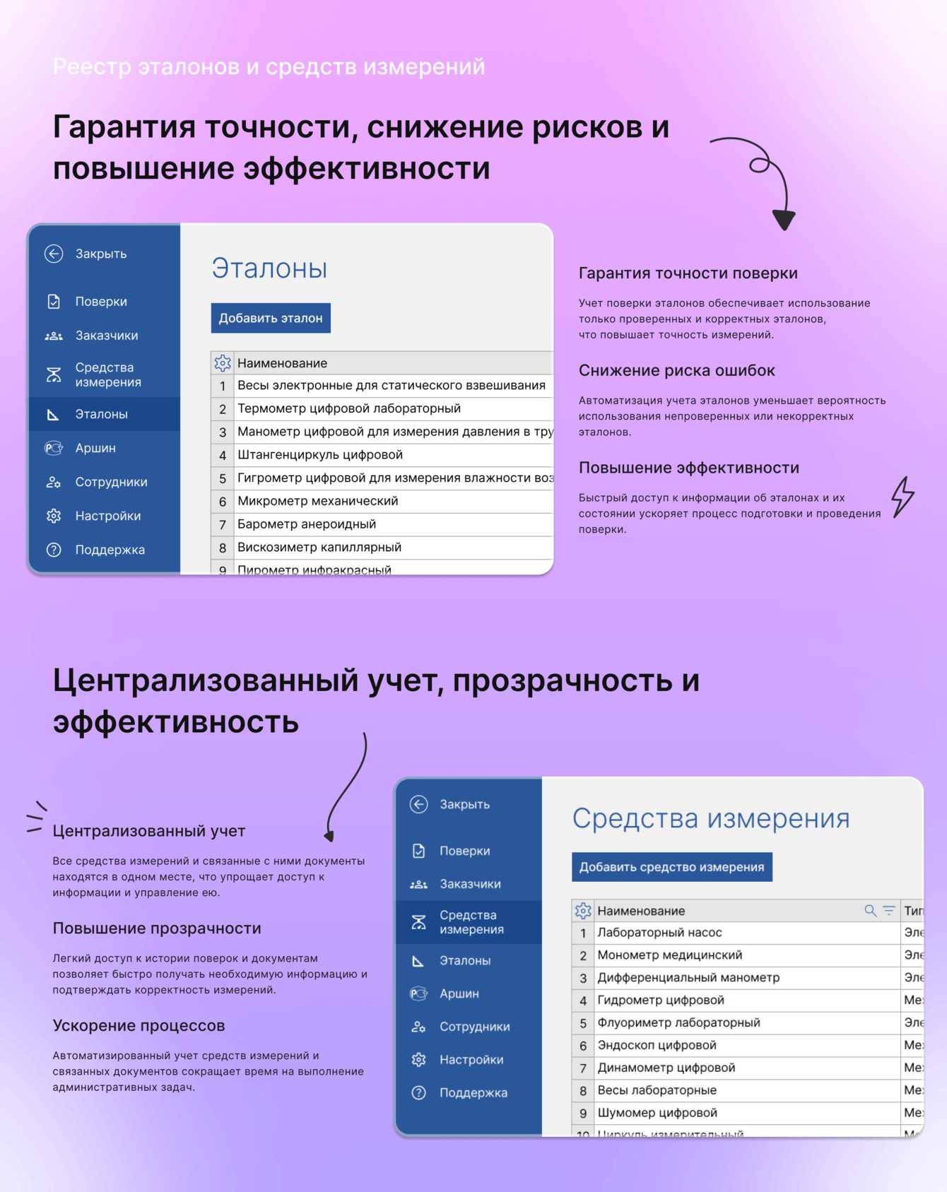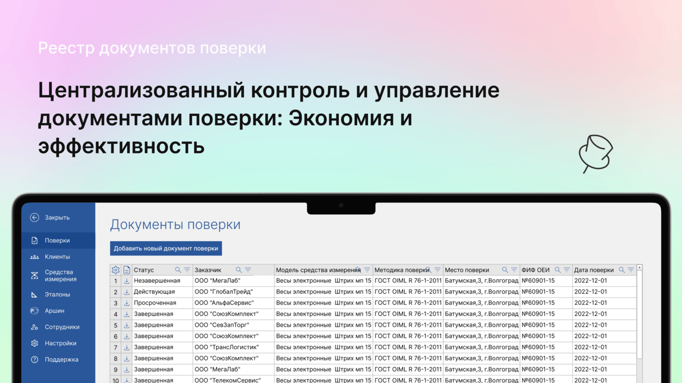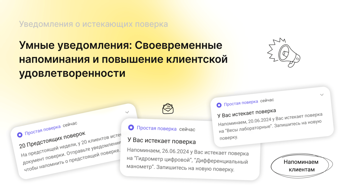 - Своевременное обновление: Автоматические уведомления позволяют своевременно напоминать клиентам о необходимости повторной поверки, что снижает риск использования некорректных средств измерений.