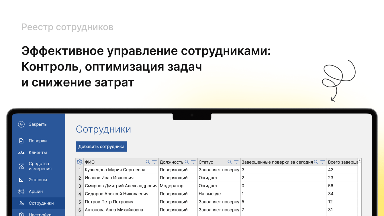 В реестре сотрудников отображаются все добавленные сотрудники. Система позволяет отслеживать, сколько документов поверки сделал каждый сотрудник, сколько документов назначено каждому сотруднику, и назначать поверки сотрудникам.