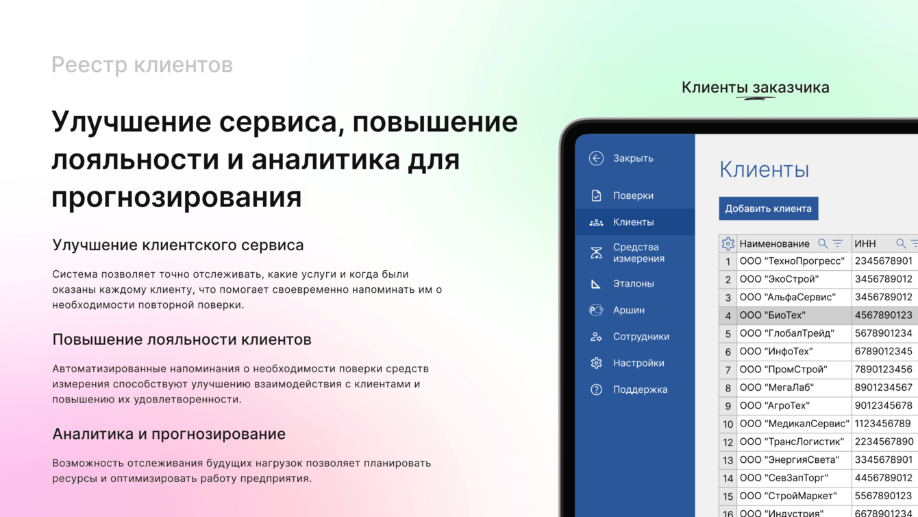 Реестр клиентов включает компании, которым была оказана услуга поверки. В нем ведется учет того, что именно проверялось у каждого клиента, и когда истекает дата поверки.