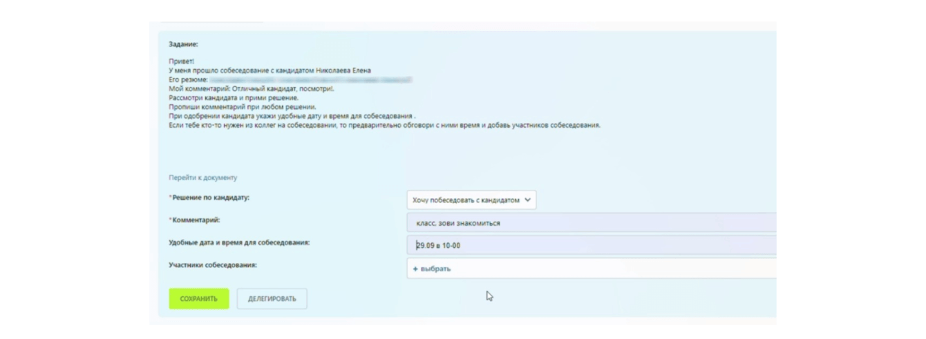 Далее, резюме с комментариями и оценкой рекрутера уходит заказчику. Если он готов рассмотреть кандидата, указывает время, участников и формат мероприятия.