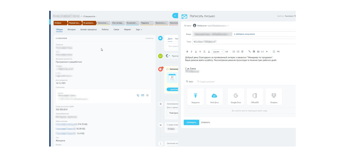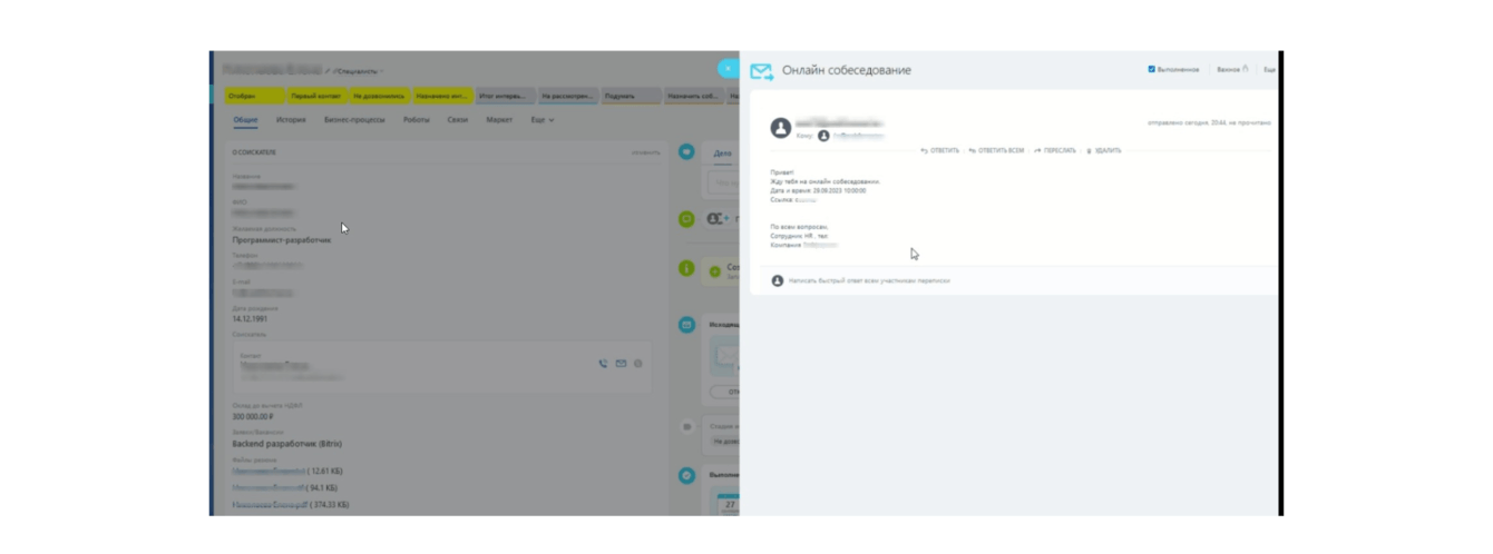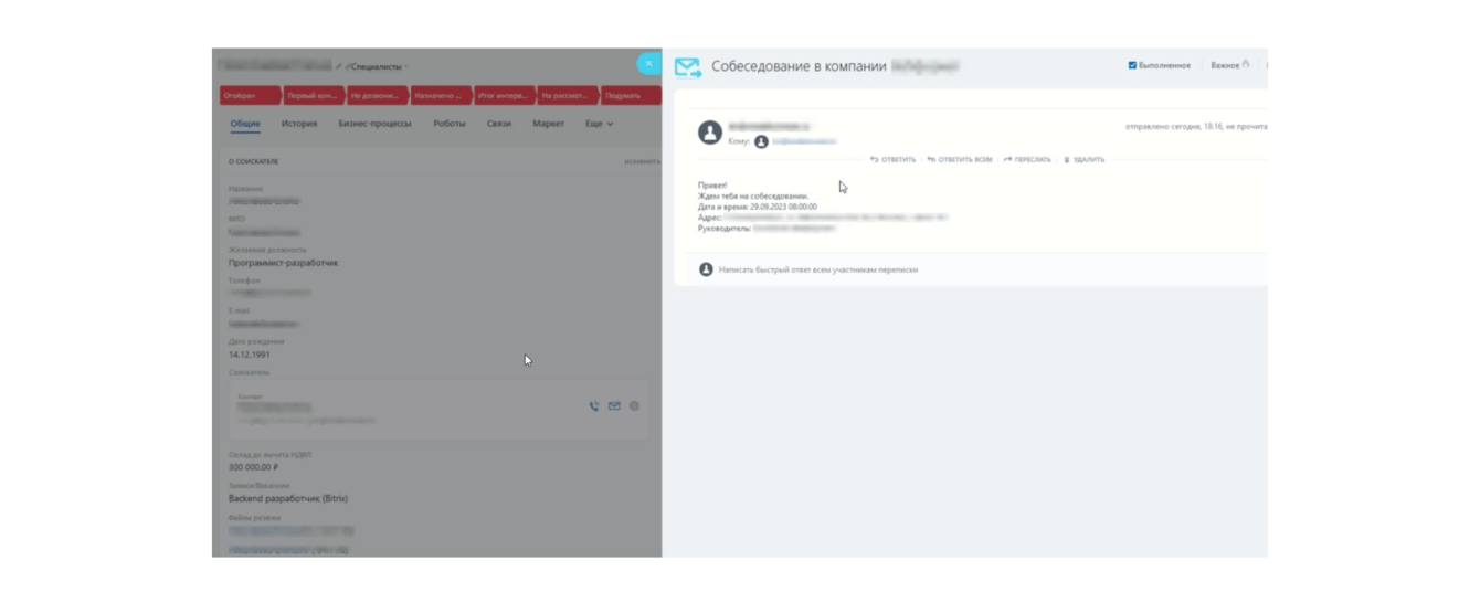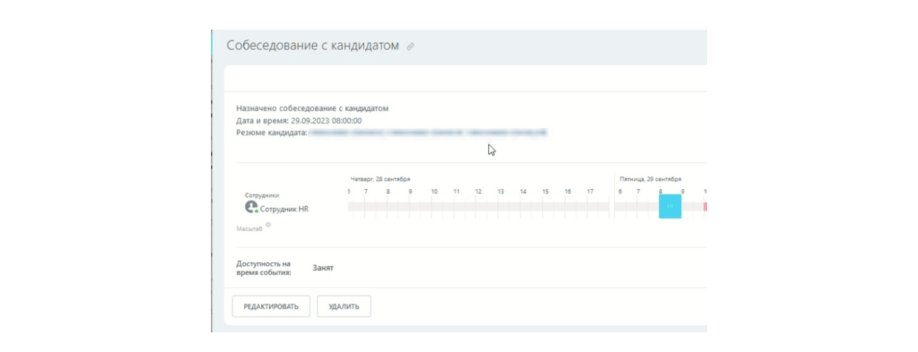 При назначении собеседования, система запрашивает данные: дату, время и формат мероприятия, а далее автоматически высылает кандидату письмо с этими данными, а также создает в календаре встречу с актуальным описанием и вложенным файлом резюме.