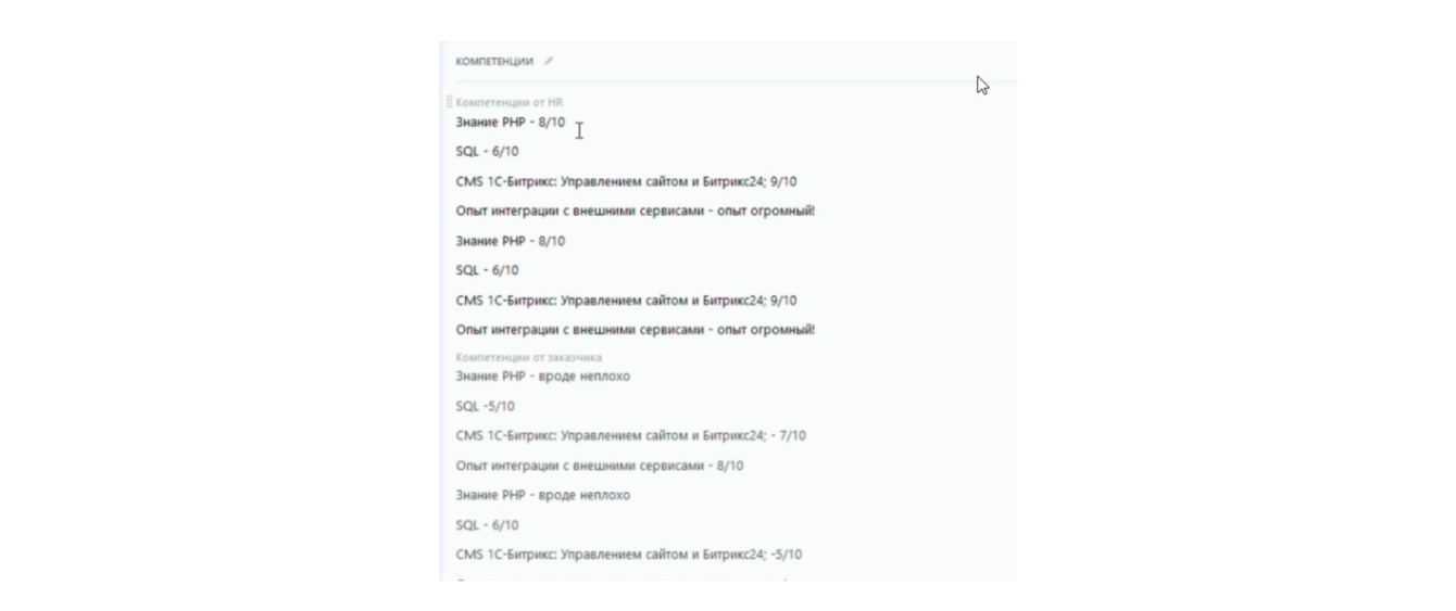 Оценка компетенций заказчика сохраняется в карточке кандидата и находится рядом с оценкой рекрутера, что позволяет более объективно произвести оценку.