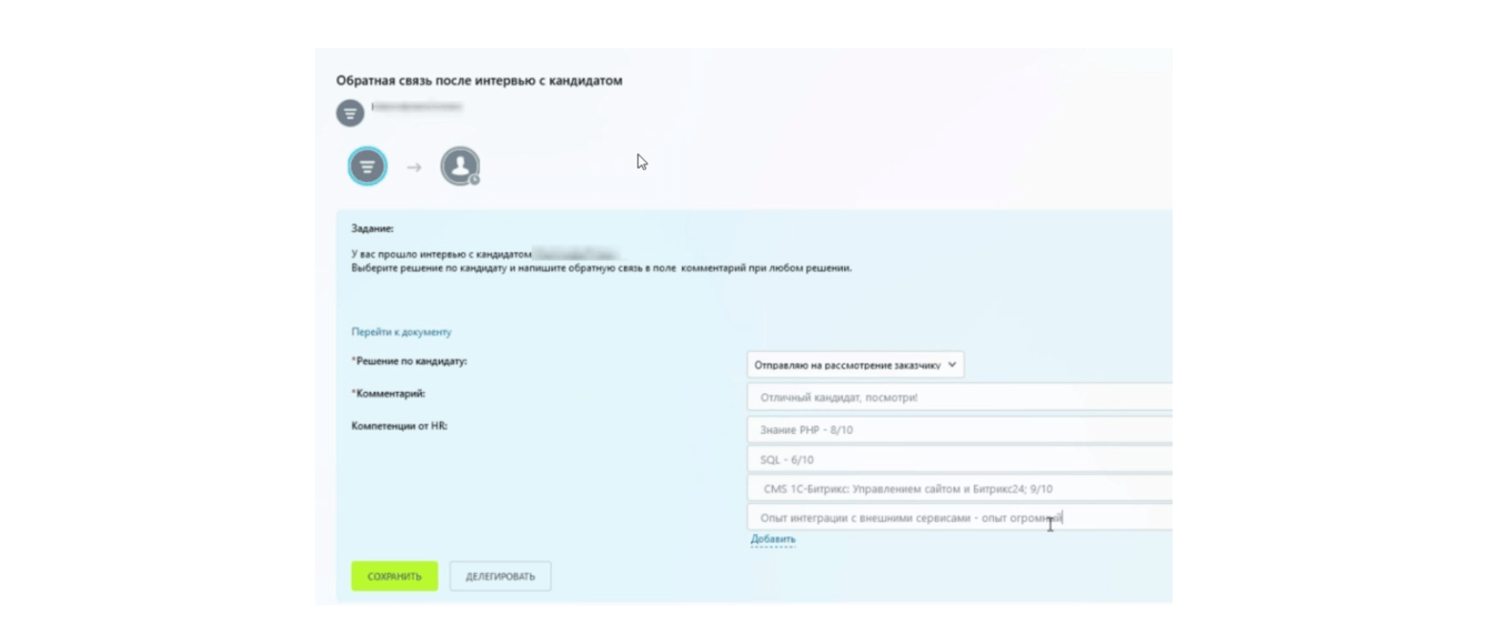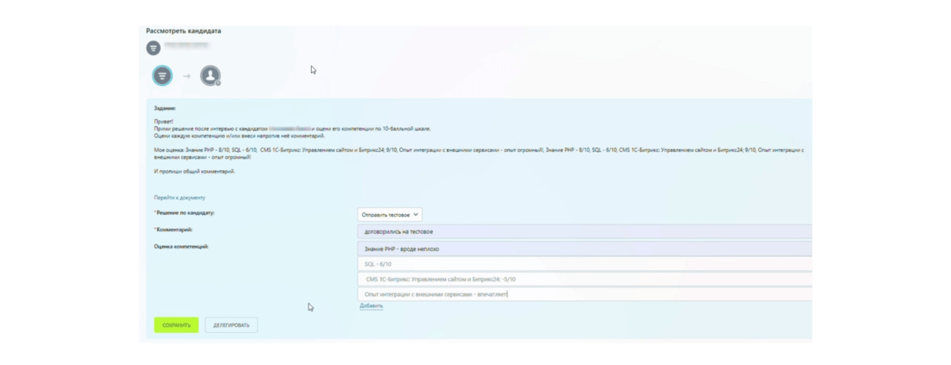 После собеседования заказчик получает задание оценить кандидата по тем же компетенциям, которые выбрали для оценки еще на старте подбора.