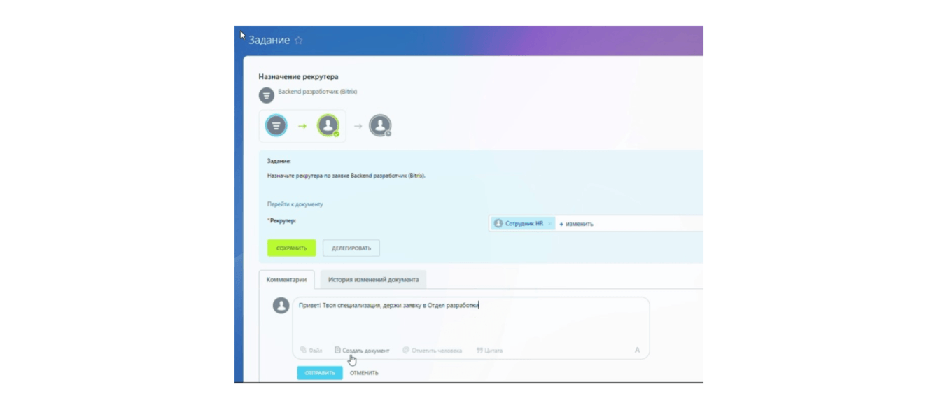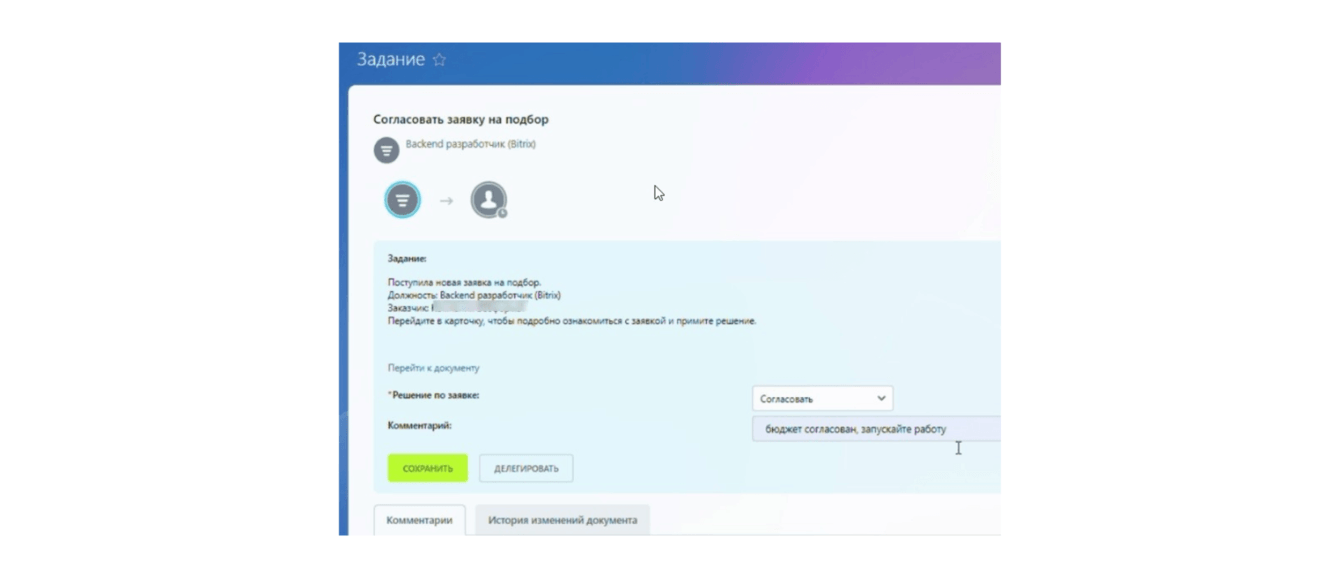 Далее заявка проходит путь от согласования бюджета на нее, до назначения ответственного рекрутера.