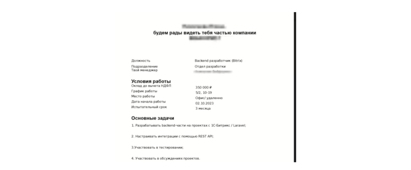 Все данные система берет из вакансии, указывает в оффере, при этом используя фирменный шаблон заказчика.