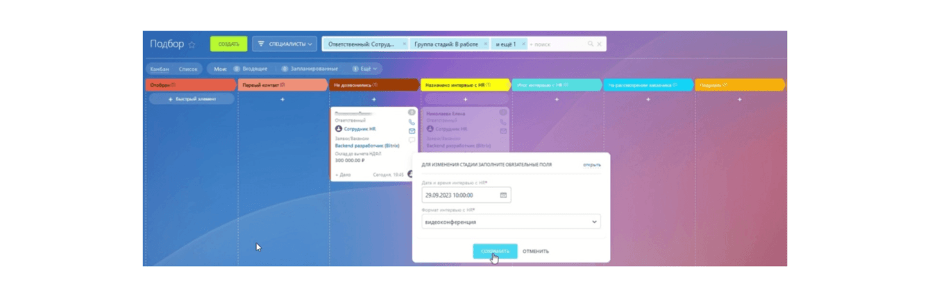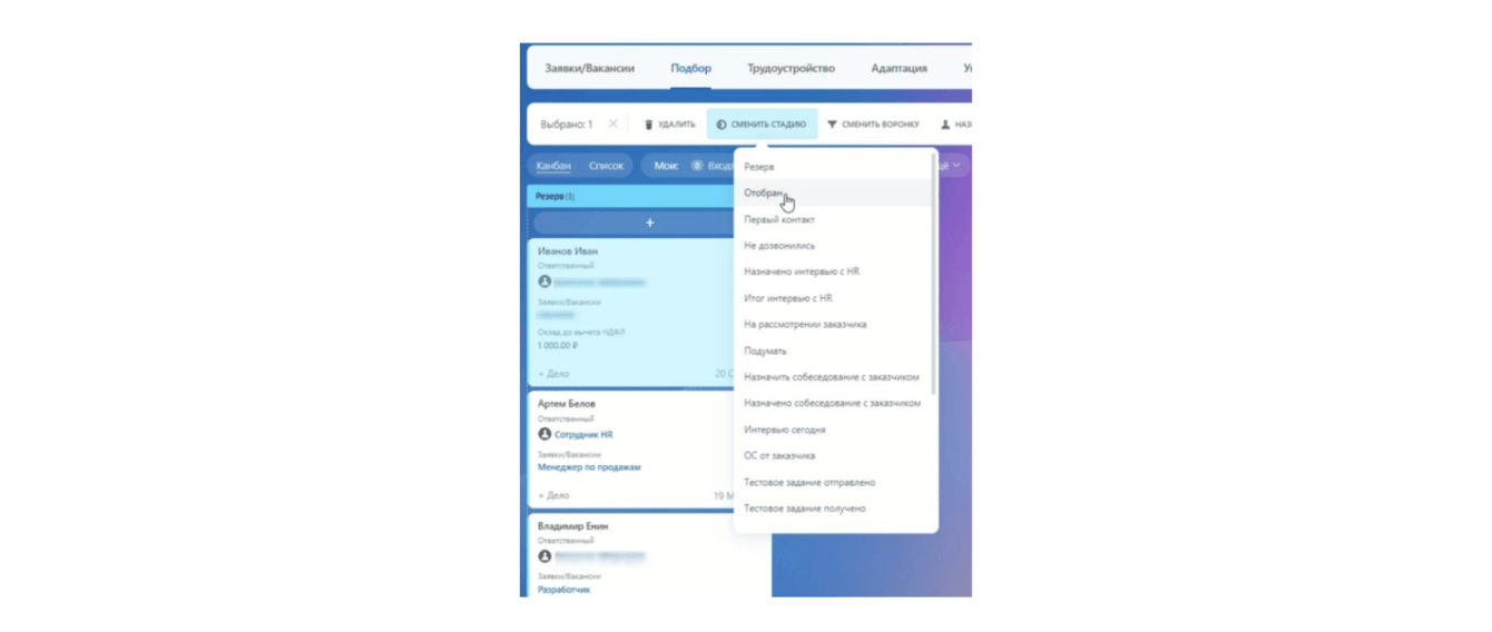 И, конечно, можем работать с кандидатами из кадрового резерва, переводя их на любой этап воронки подбора