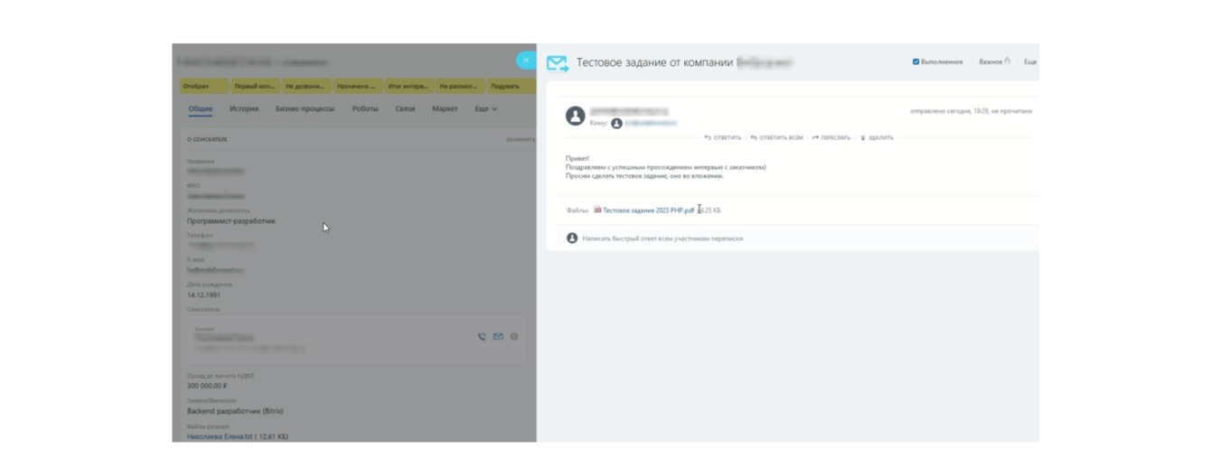 Получение и проверку тестового задания пока оставили в ручной обработке. Но и этот участок можно автоматизировать с помощью форм, например.