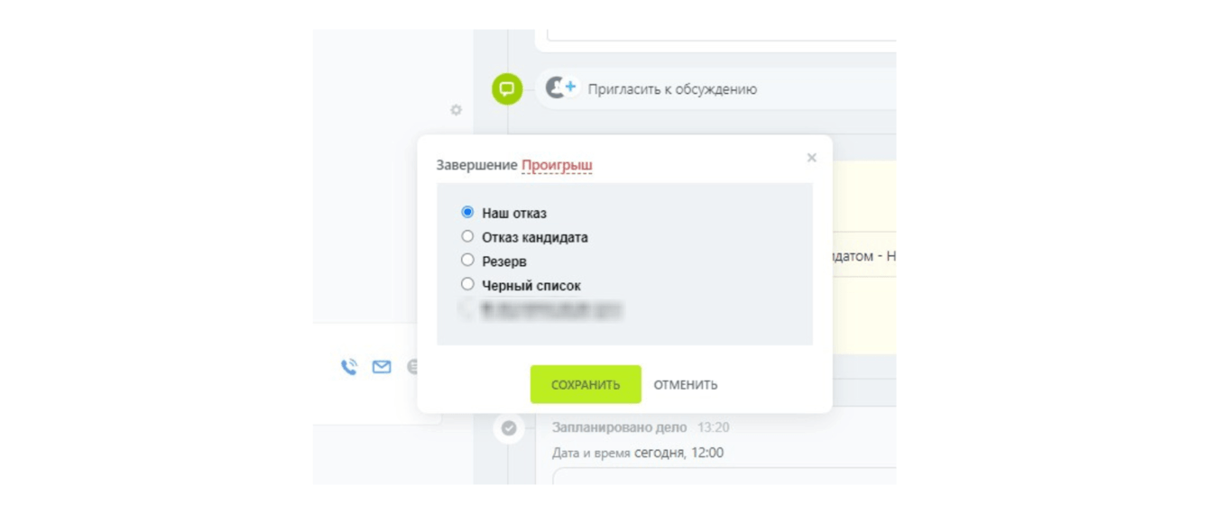 Если кандидат отказался, выбираем варианты негативного сценария развития событий и система обязательно попросит указать комментарий для дальнейшего анализа данных.
