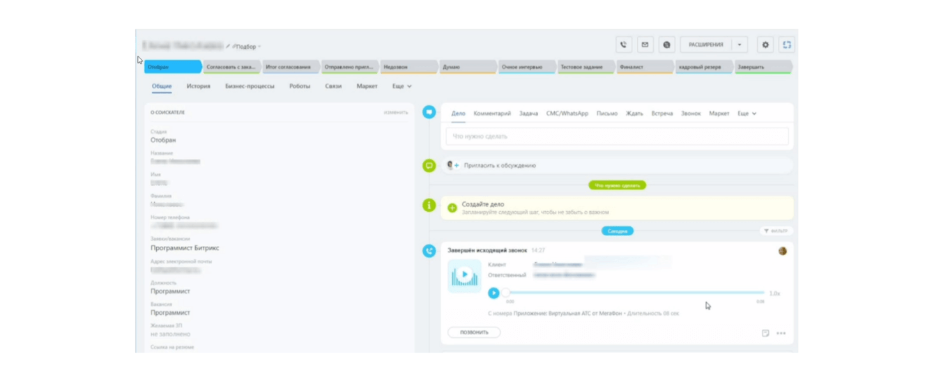 Прямо из карточки соискателя можно совершать звонки через корпоративную телефонию, записи разговоров будут сохранены в карточке, что позволит работать над уровнем лояльности рекрутеров.