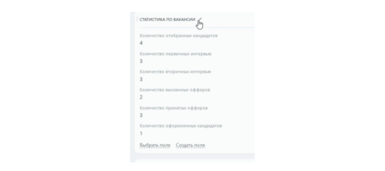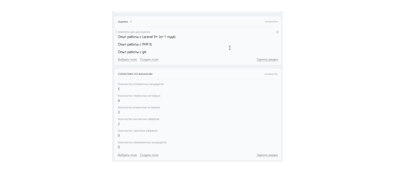 Каждая вакансия умеет собирать аналитику воронки подбора и хранит эти данные в карточке вакансии.