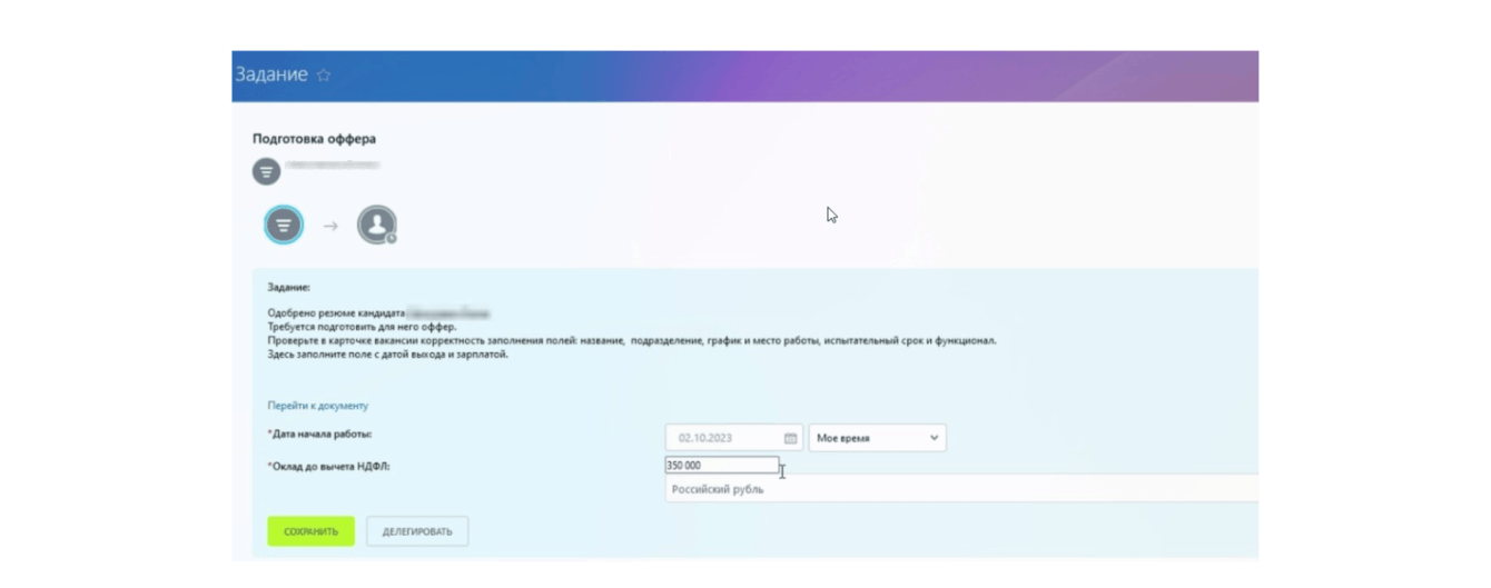 При переносе карточки на стадию «Подготовка оффера», система запрашивает сумму заработной платы и дату выхода.