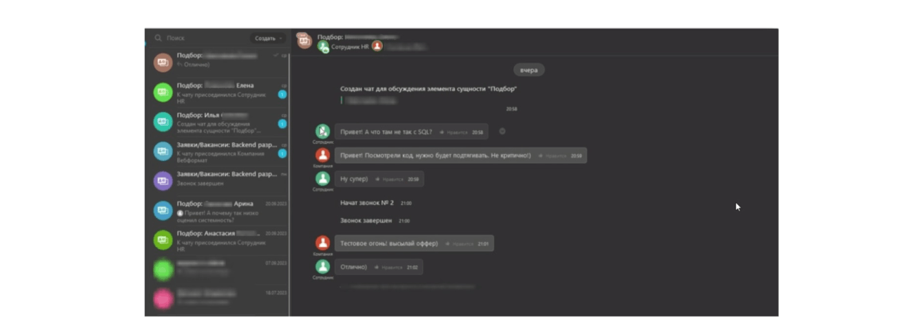 Из карточки кандидата можем создать чат одним кликом. Он будет иметь название с именем кандидата, а участниками будут представители заказчика. Плюс этой возможности в том, что вы точно не потеряете обсуждение кандидата в личных чатах.