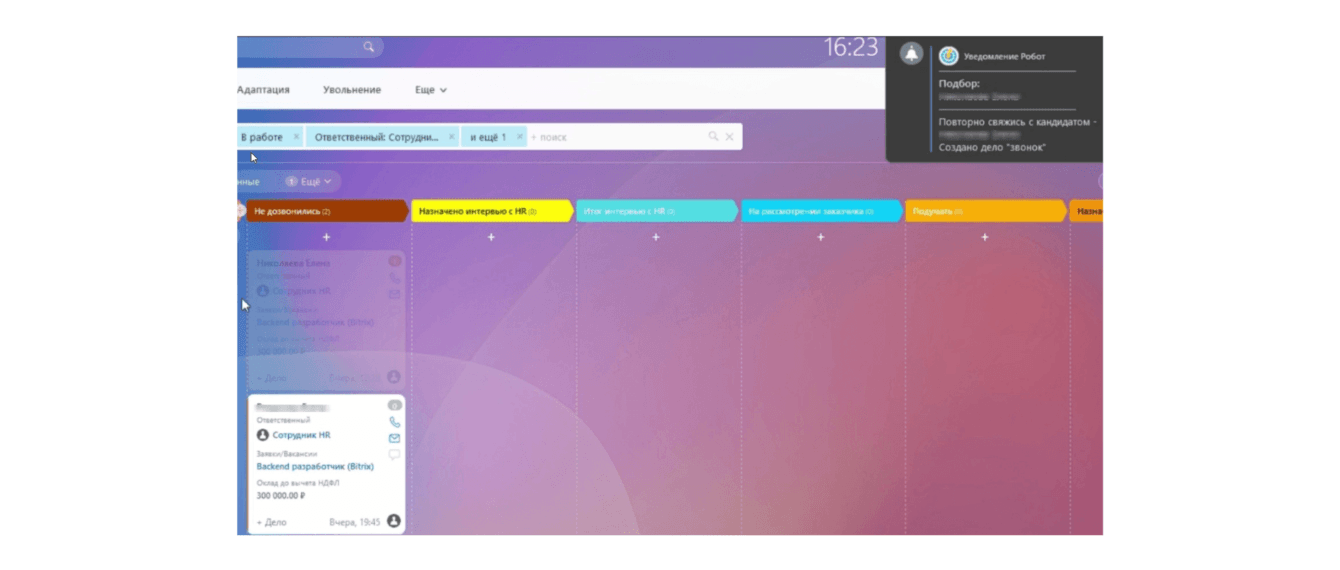 При переносе карточки соискателя на этап «Не дозвонились», система высылает уведомление через час повторно связаться с кандидатом.