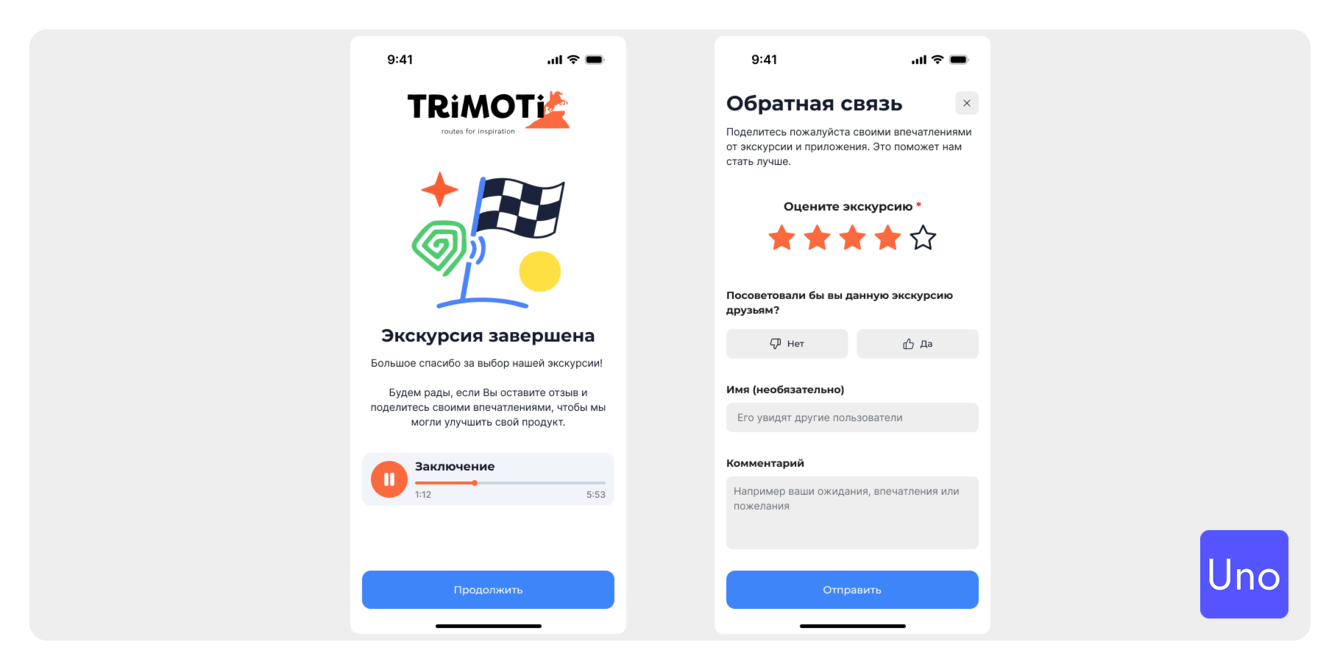 Клиент запросил, чтобы окно обратной связи появлялось автоматически после прохождения 50% экскурсии, 75% экскурсии и по окончанию. Если же пользователь заполнил и отправил обратную связь, то она больше не появляется по этой экскурсии. Если же не заполнил, то окно окончания экскурсии становится двухшаговым, где первый экран - заключительное аудио и благодарность, а второй - то же самое окно обратной связи.