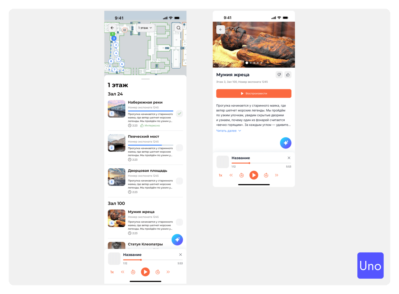 Экран музейной экскурсии сильно отличается от экрана уличной экскурсии навигацией по залам, наличием этажей и номеров экспонатов. Это отразилось и в добавлении экскурсии в CRM. В остальном, принципы и функции данного экрана те же, что и в уличной экскурсии.