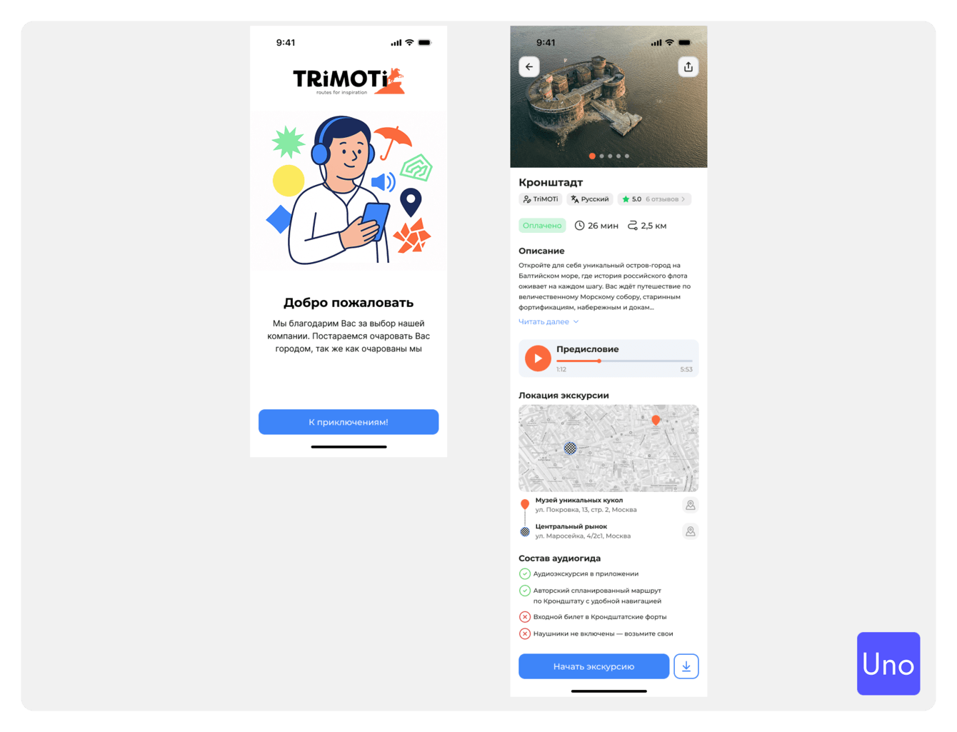 При первом входе и сканировании QR-кода купленной экскурсии пользователь попадает на экран онбординга, а далее на экран с описанием экскурсии.