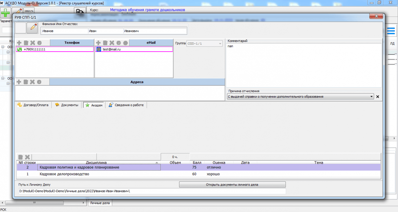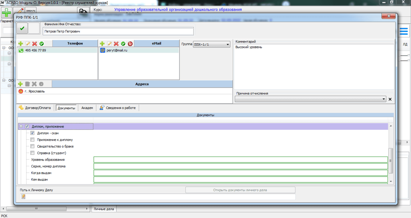 Программа позволяет вести работу по учету обучающихся по разным организациям и курсам: хранение и изменение данных, распределение по группам, ведение задолженности, контроль оценок итоговой аттестации. Подготовка данных для передачи информации в программу печати документов об образовании.